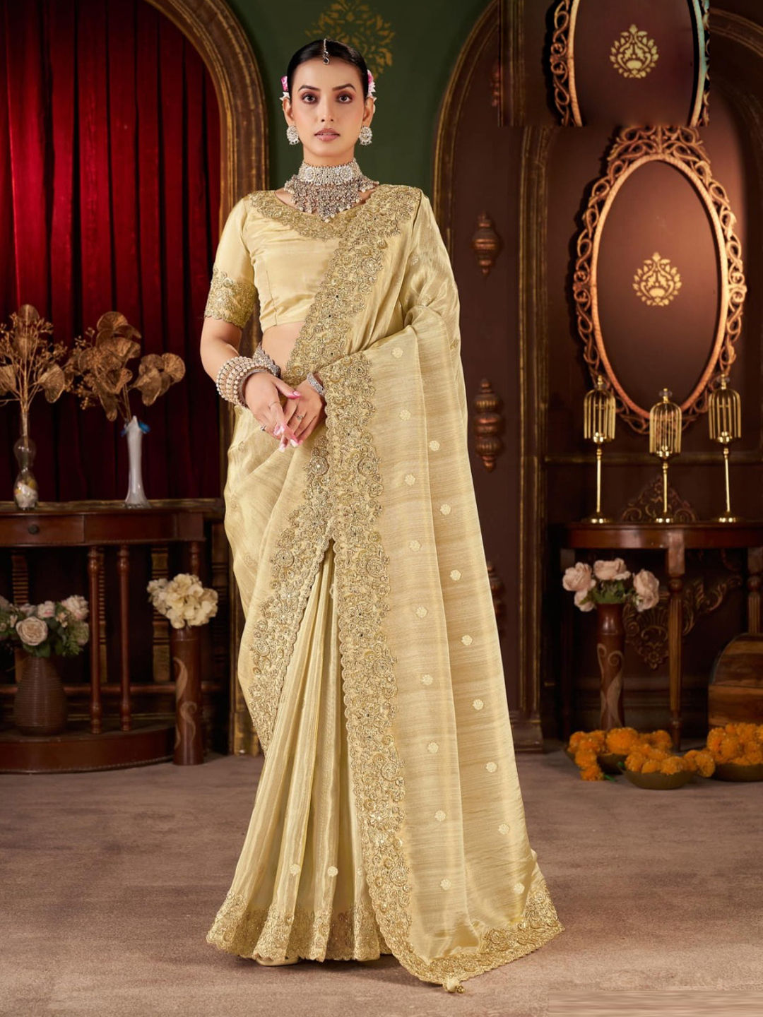 Beige and Brown color Saree in Tissue, Viscose fabric with Embroidered, Sequence, Thread, Weaving, Zari work