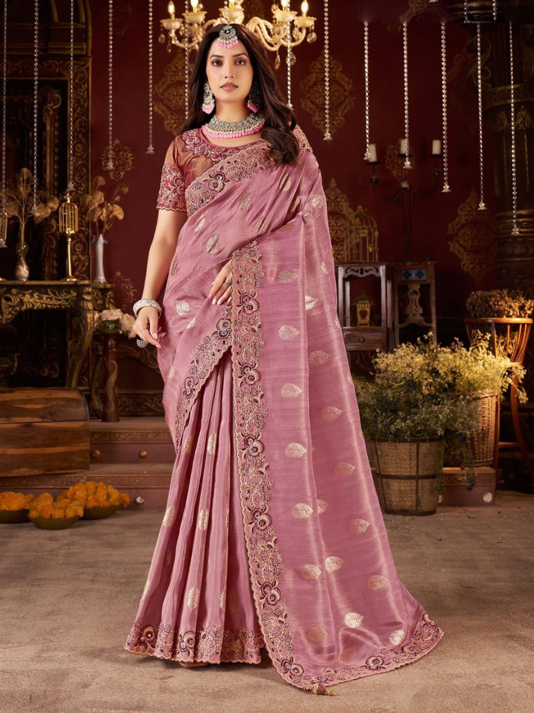 Pink and Majenta color Saree in Tissue, Viscose fabric with Embroidered, Sequence, Thread, Weaving, Zari work
