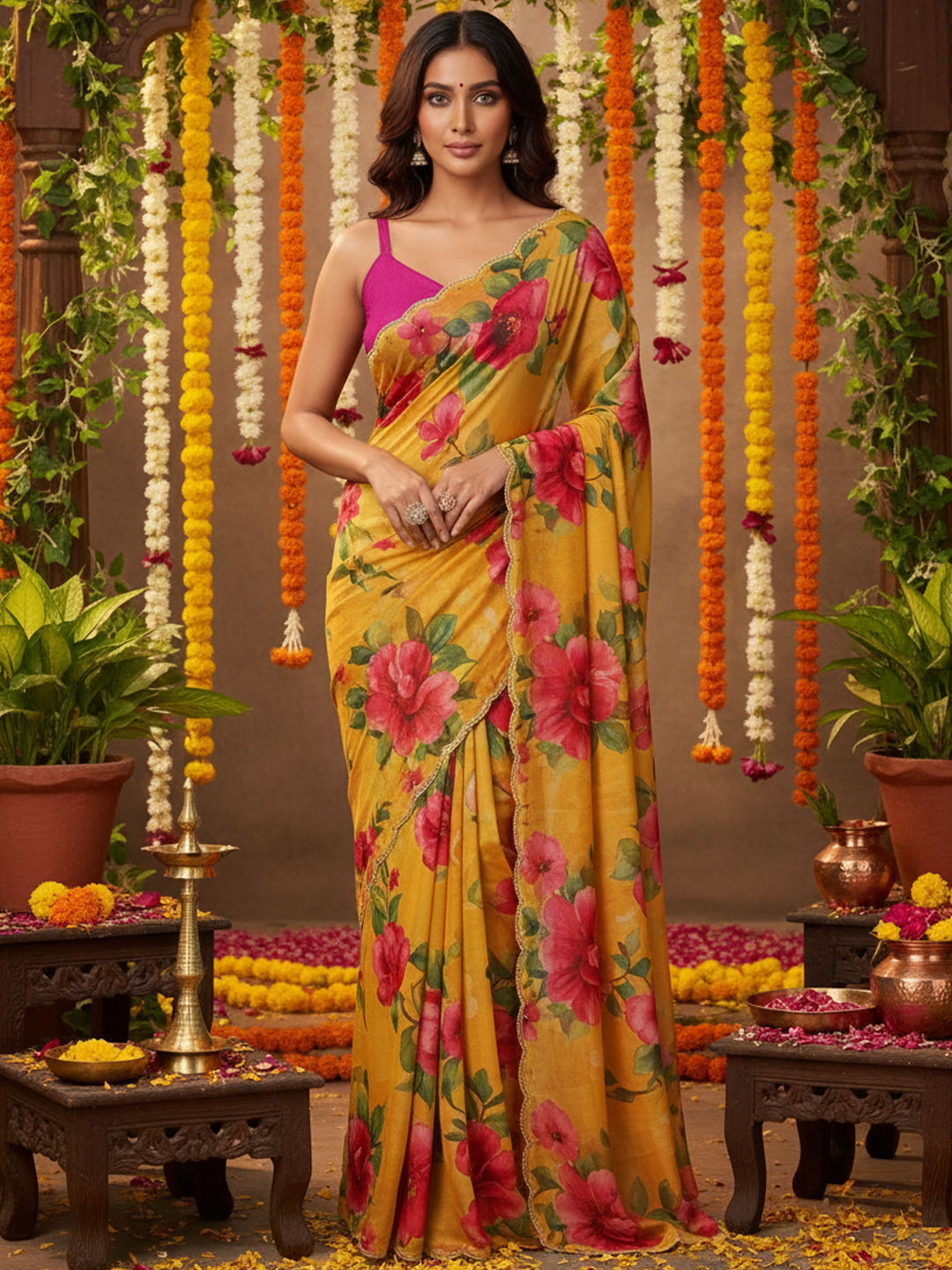 Yellow color Saree in Tissue fabric with Cut Dana, Floral, Moti work