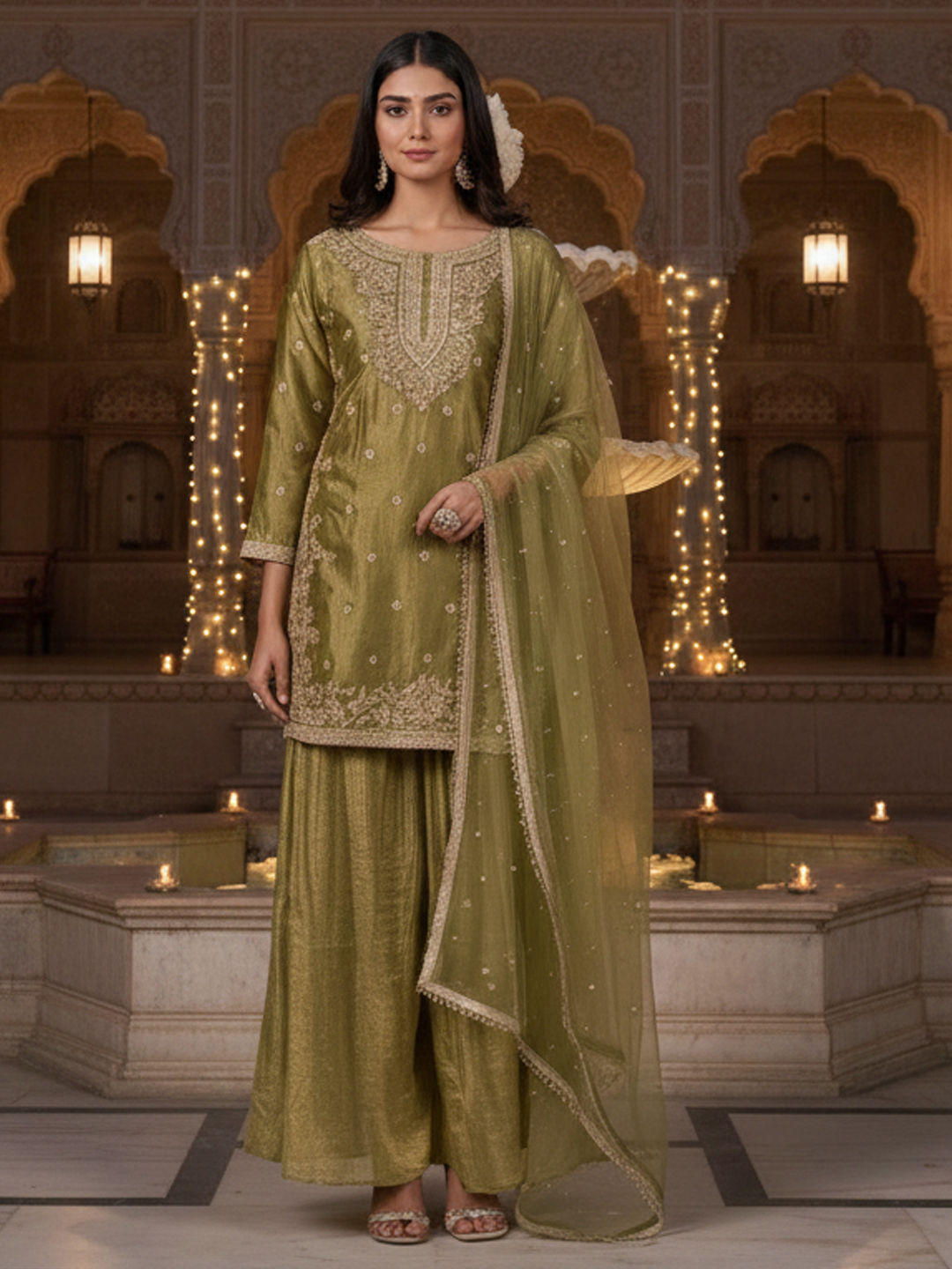 Green color Salwar Kameez in Tissue fabric with Embroidered, Moti, Thread work