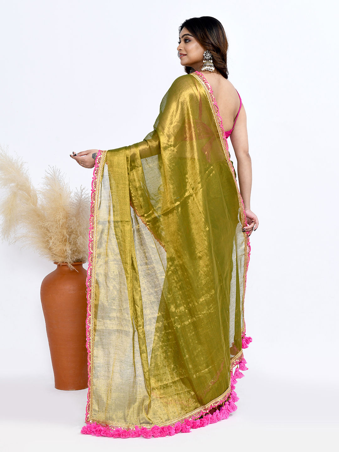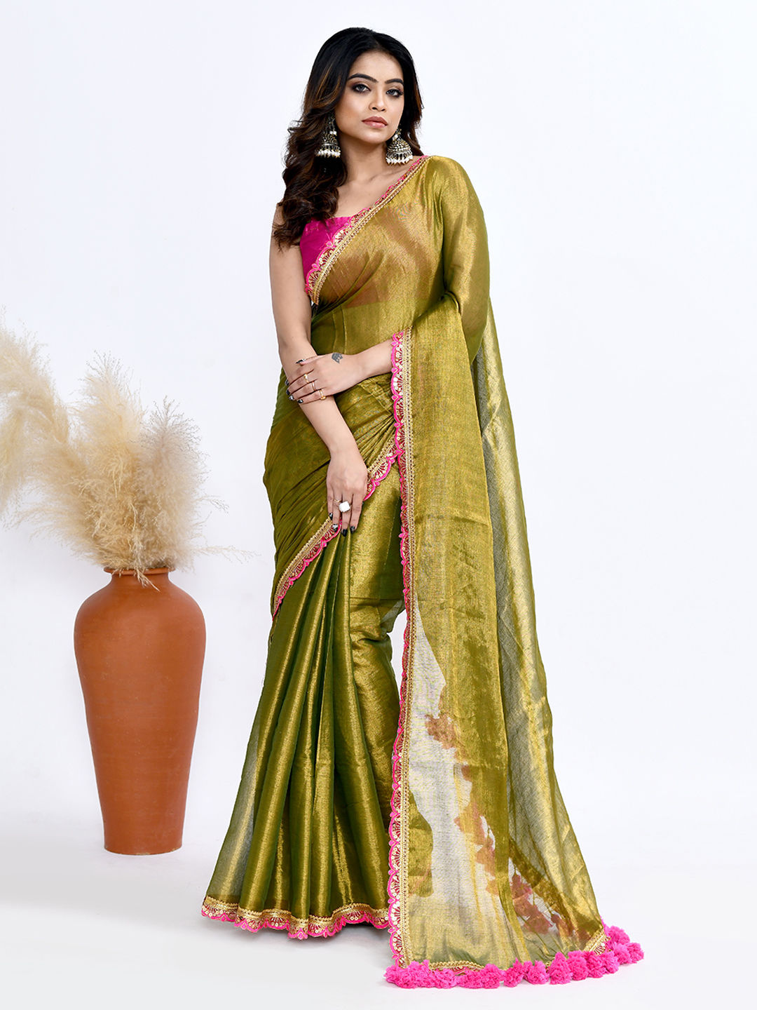 Green color Saree in Tissue fabric with Lace, Sequence work