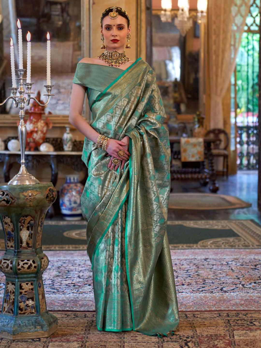 Tissue Traditional Saree in Green with Weaving work