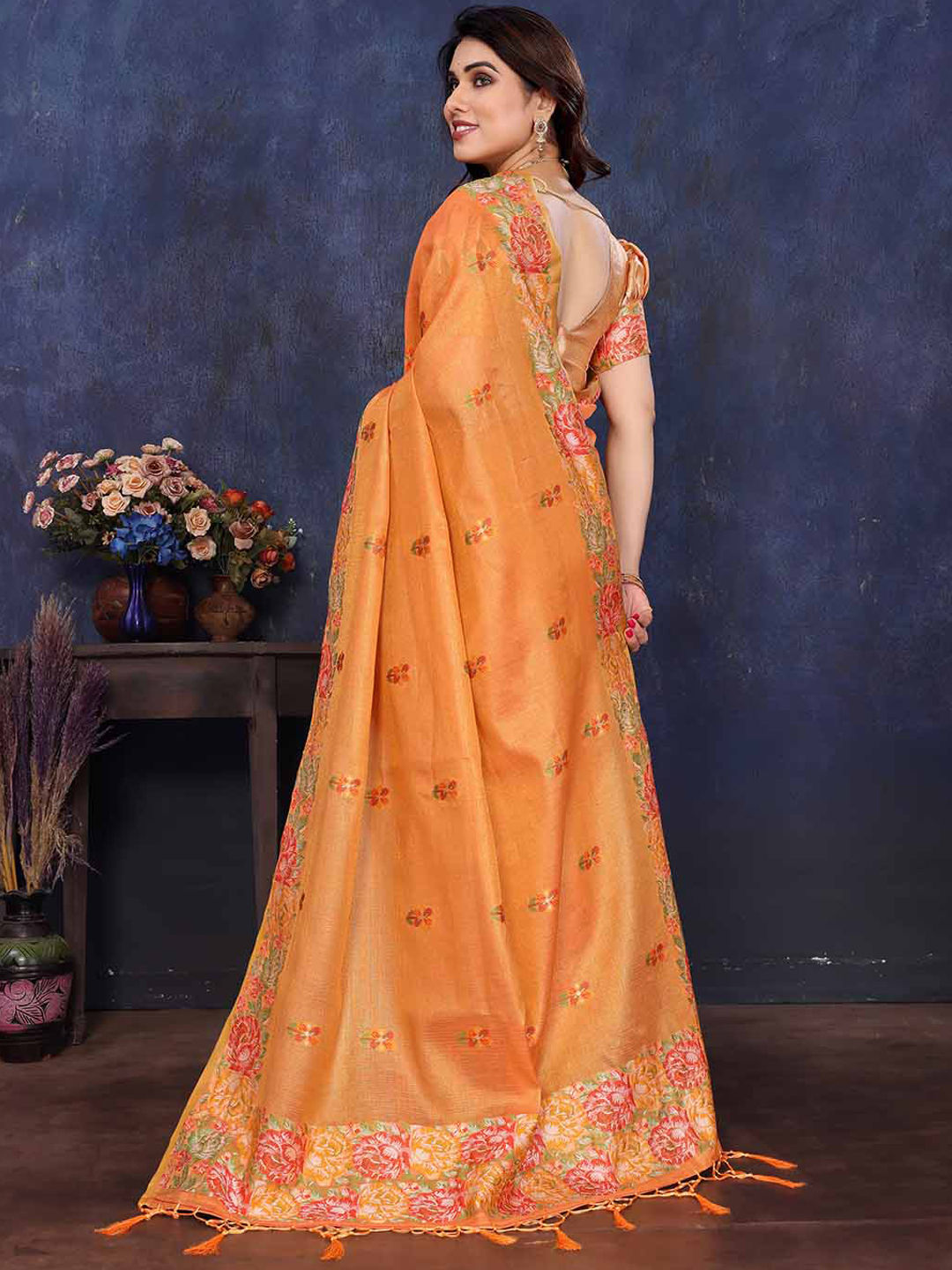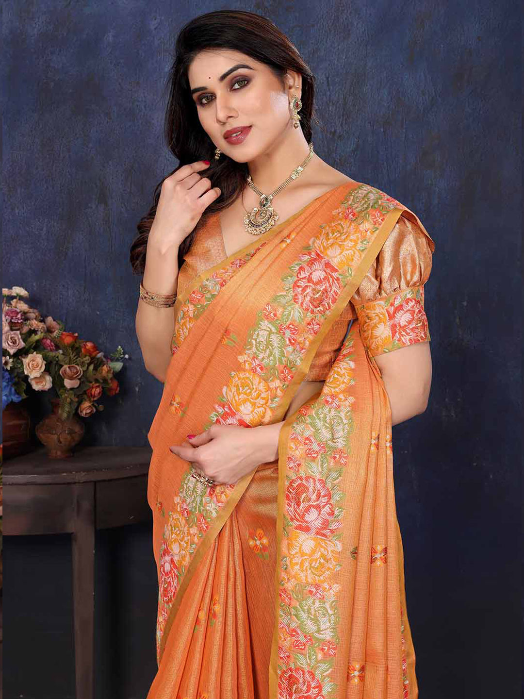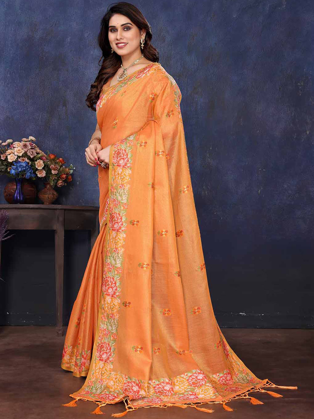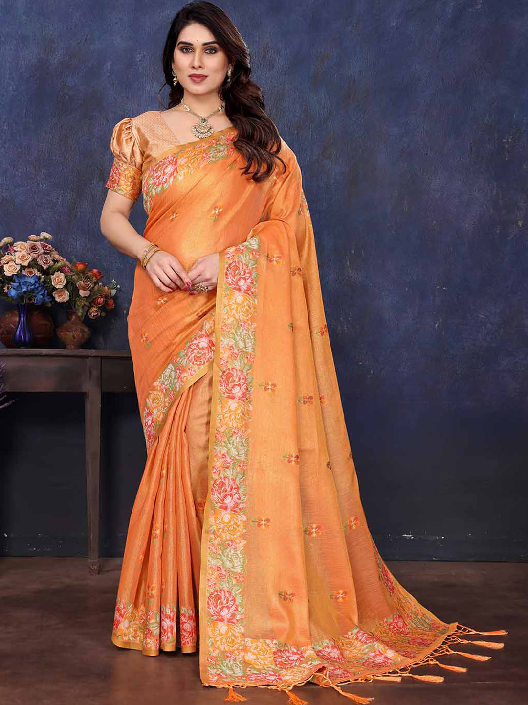 Orange color Saree in Tissue fabric with Floral, Printed work