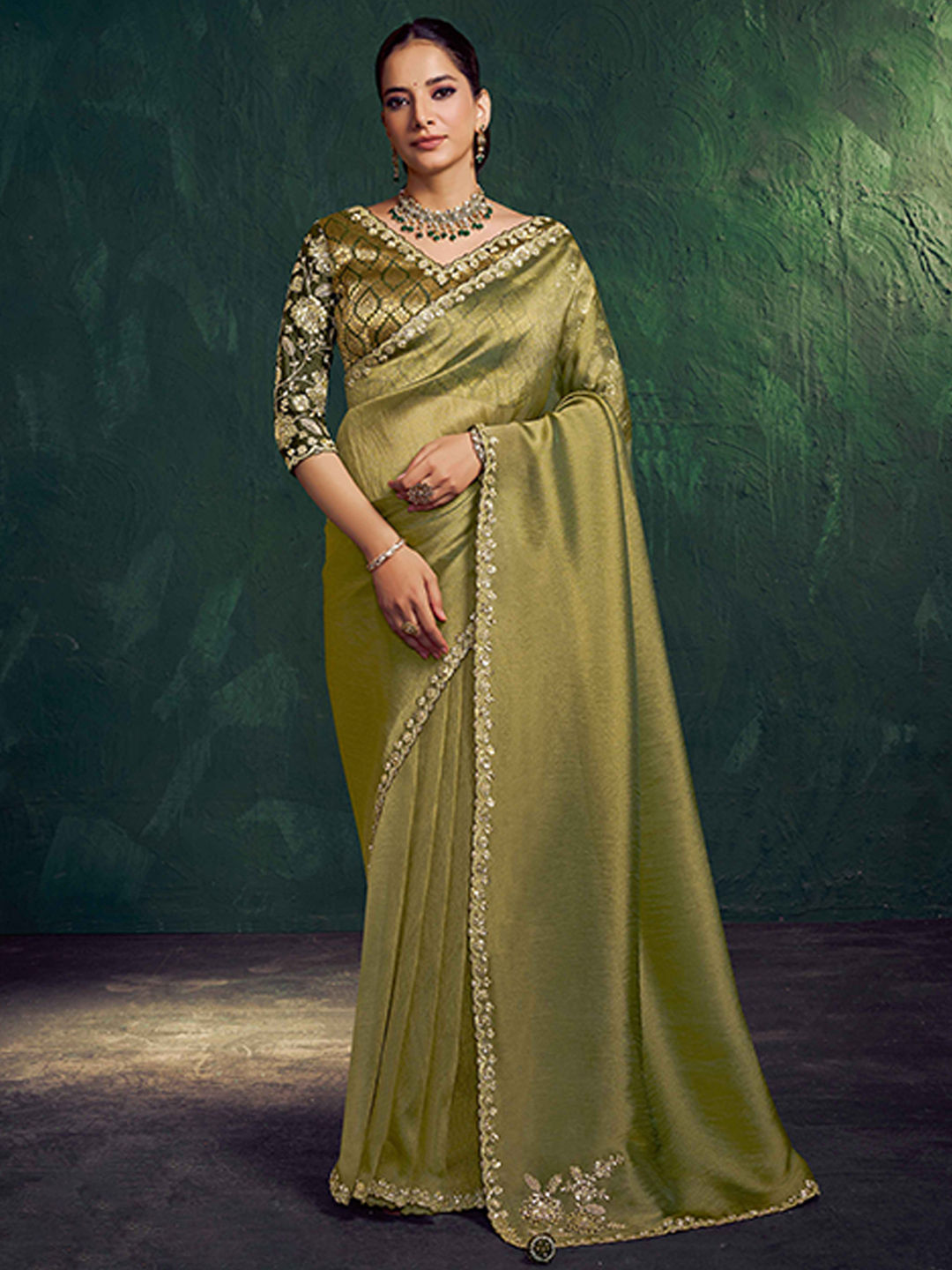 Tissue Mehendi Sangeet Readymade Saree in Green with Border work