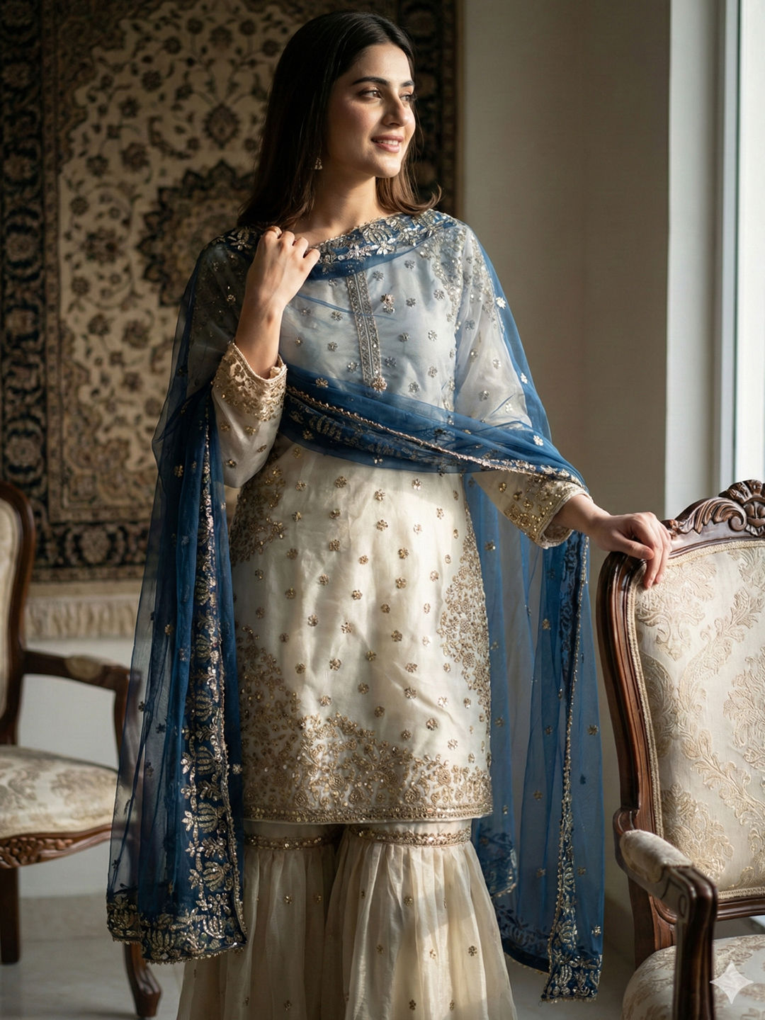 Blue, White and Off White color Salwar Kameez in Tissue fabric with Sequence work