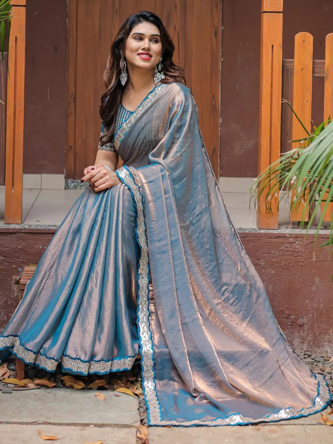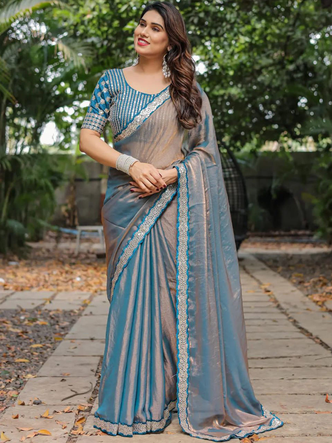 Blue color Saree in Tissue fabric with Border, Embroidered, Sequence, Thread work