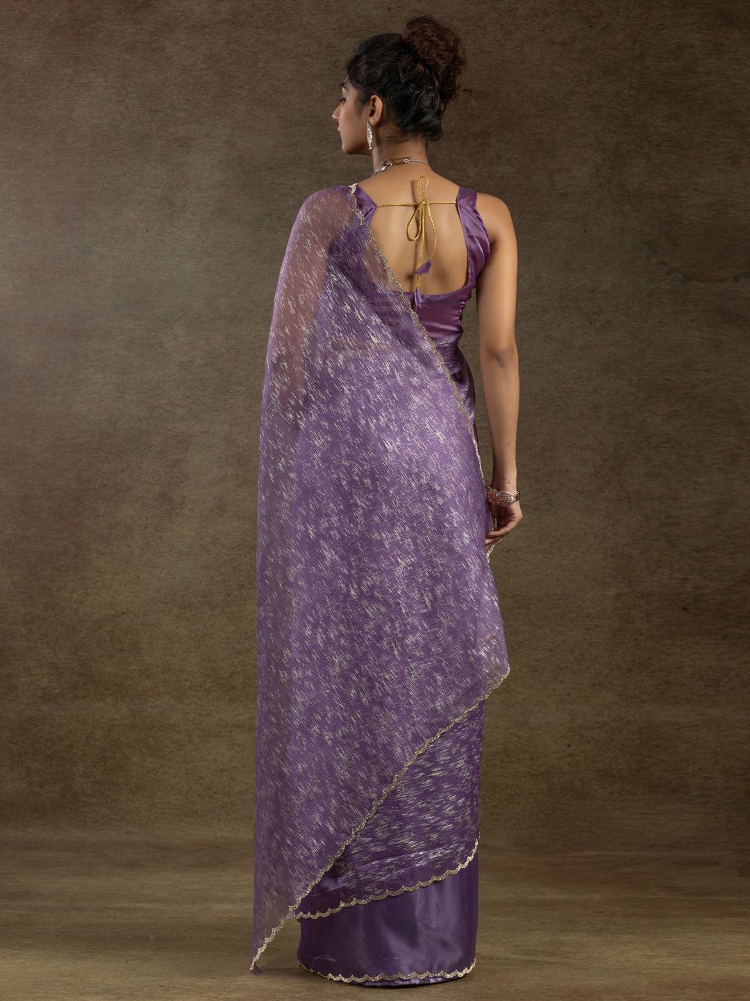 Purple and Violet color Readymade Saree in Tissue fabric with Stone work