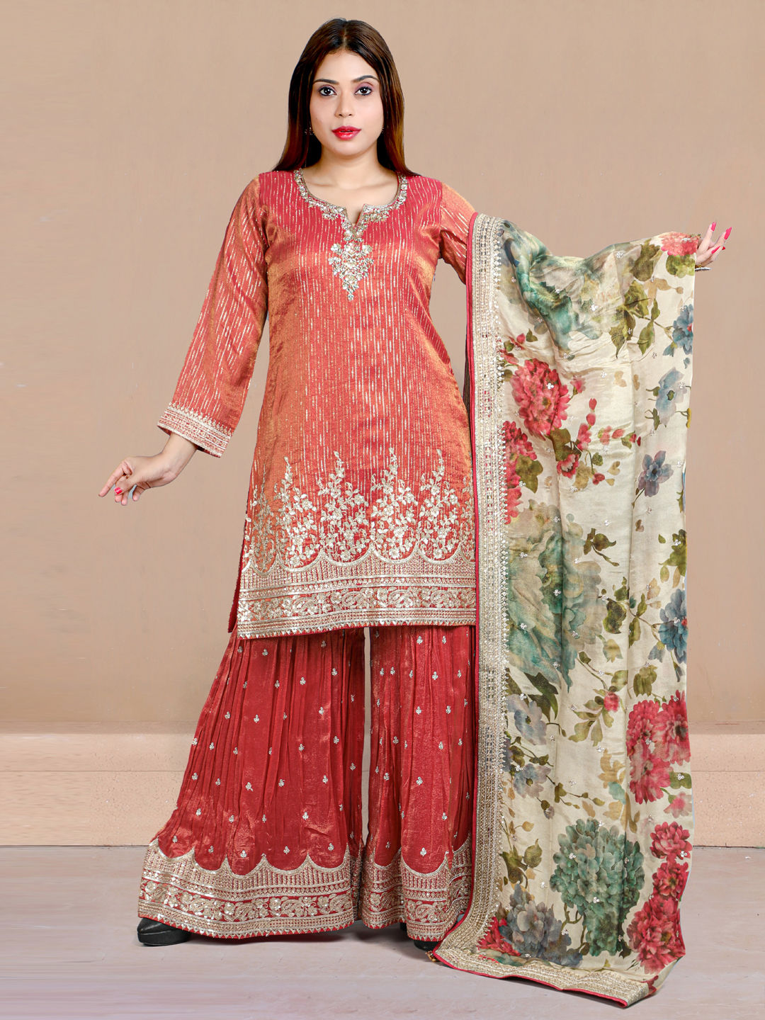 Beige and Brown color Salwar Kameez in Tissue fabric with Embroidered, Sequence, Thread work