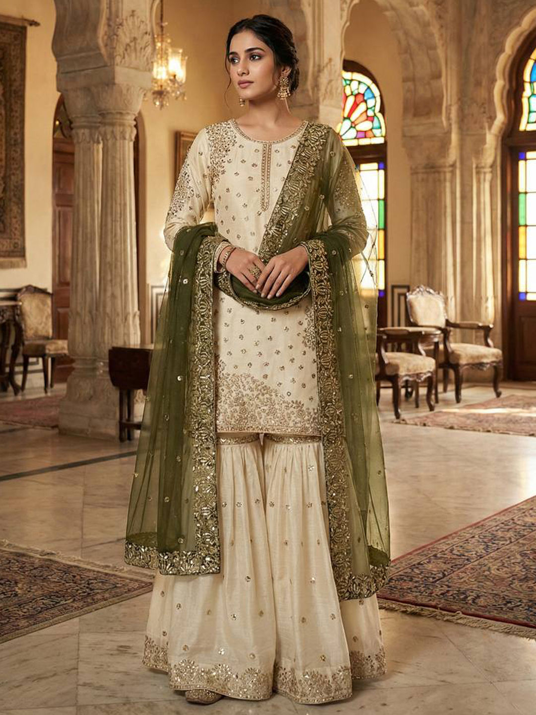 Green, White and Off White color Salwar Kameez in Tissue fabric with Embroidered, Sequence, Thread work
