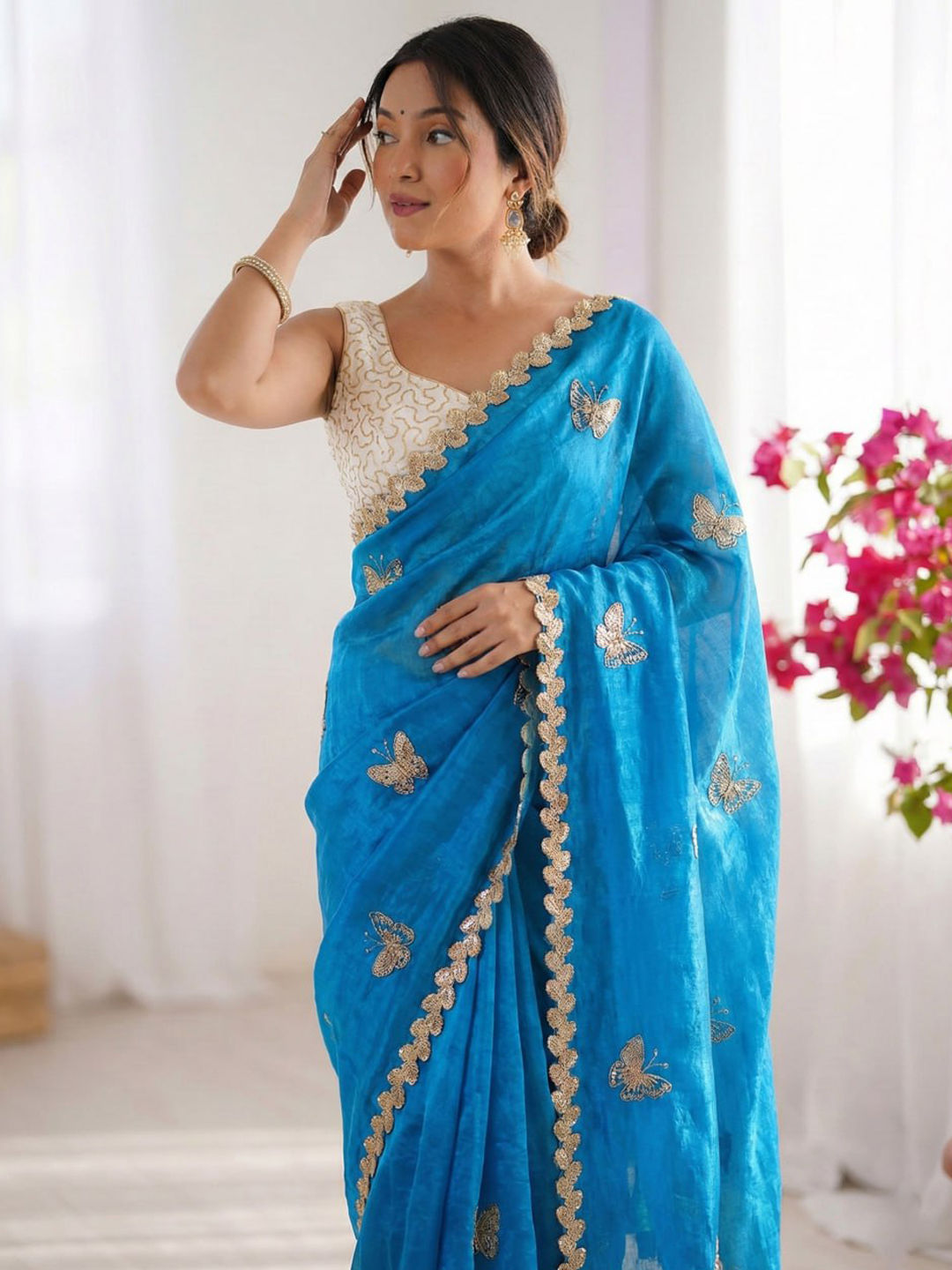 Blue color Saree in Tissue fabric with Embroidered, Lace, Sequence work