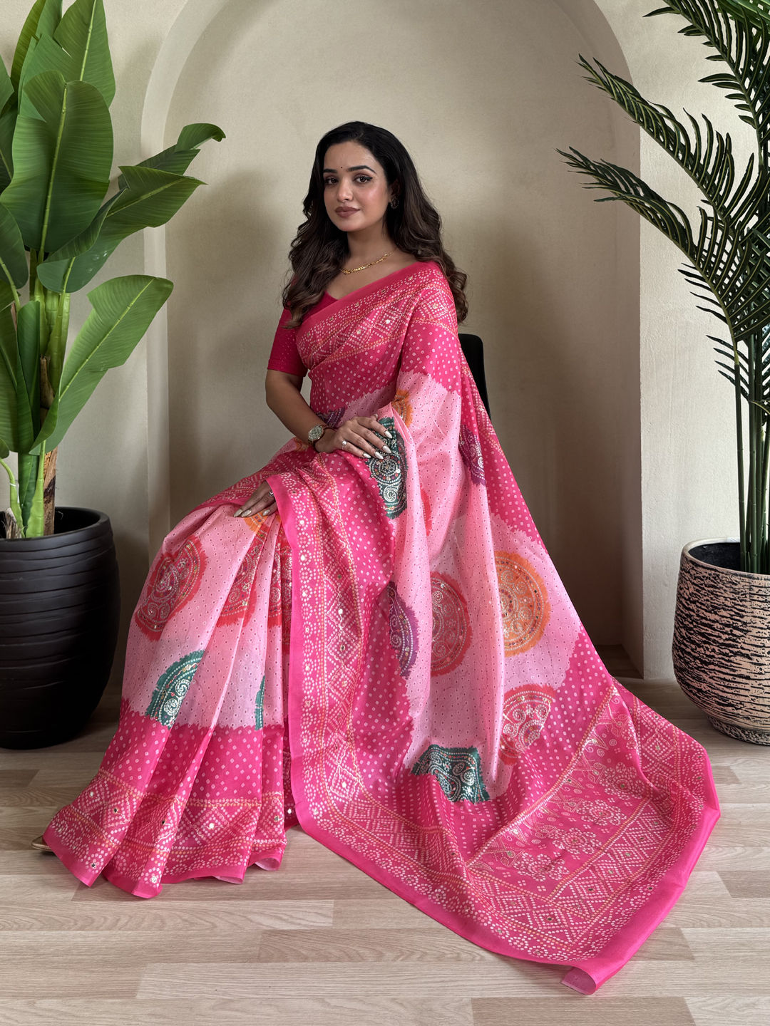 Pink and Majenta color Saree in Tissue fabric with Bandhej, Bugle Beads, Printed work