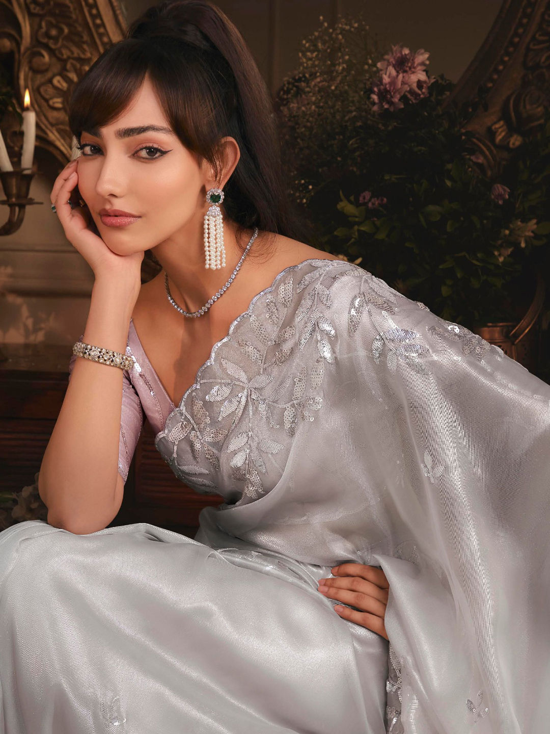 White and Off White color Saree in Tissue fabric with Embroidered, Sequence work