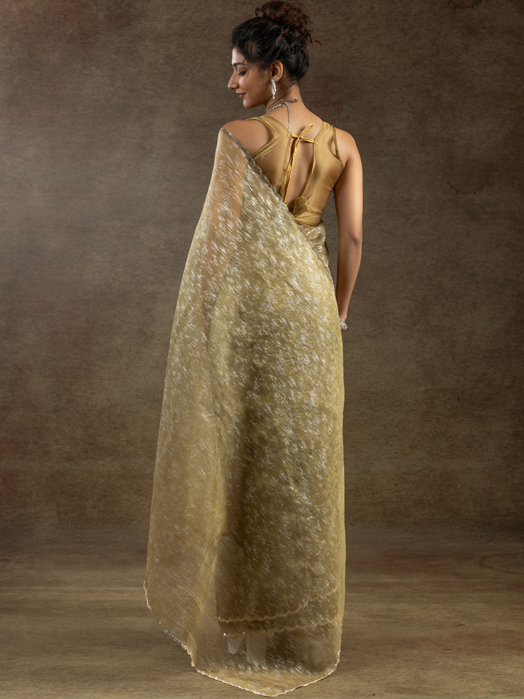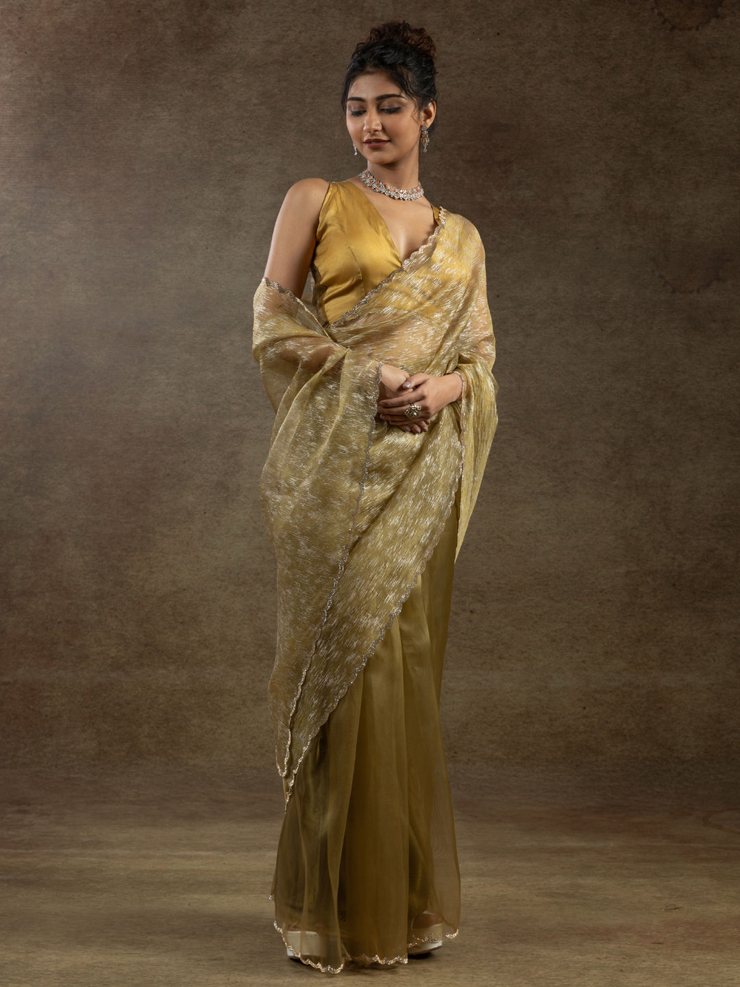 Yellow color Readymade Saree in Tissue fabric with Stone work