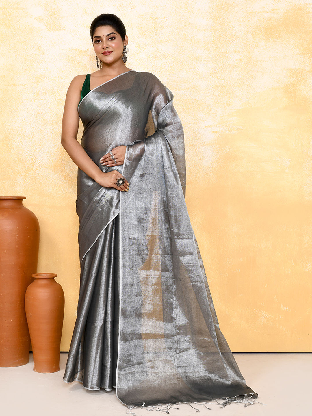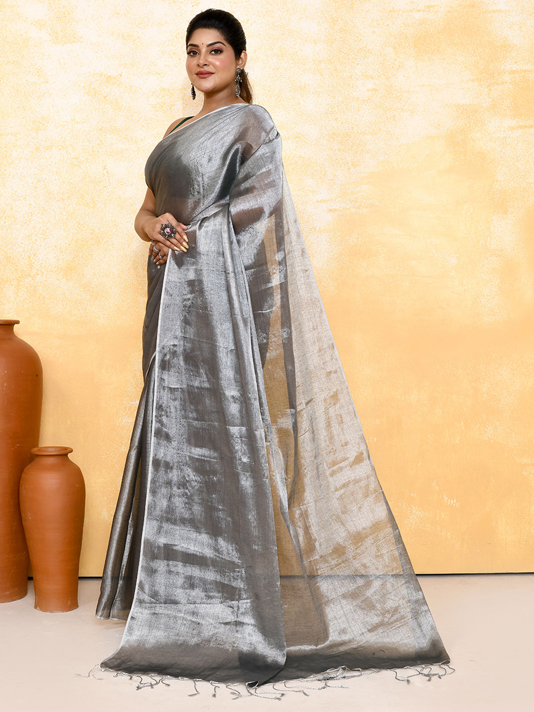 Black and Grey color Saree in Tissue fabric with Weaving work