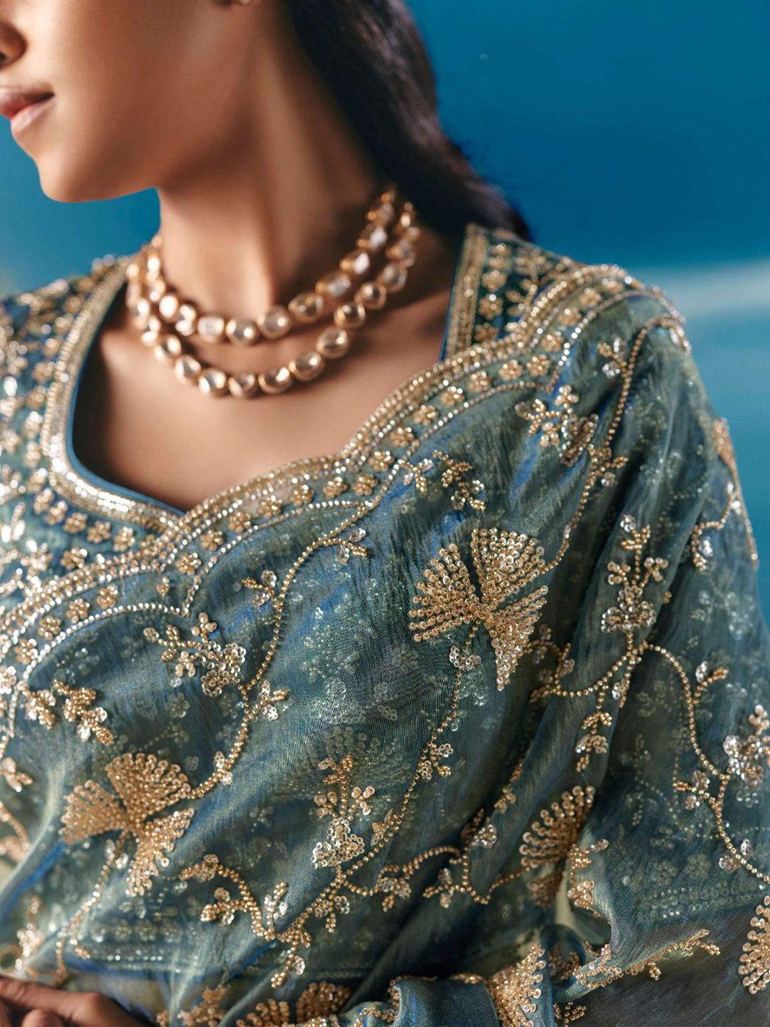 Blue color Saree in Tissue fabric with Cut Dana, Sequence work