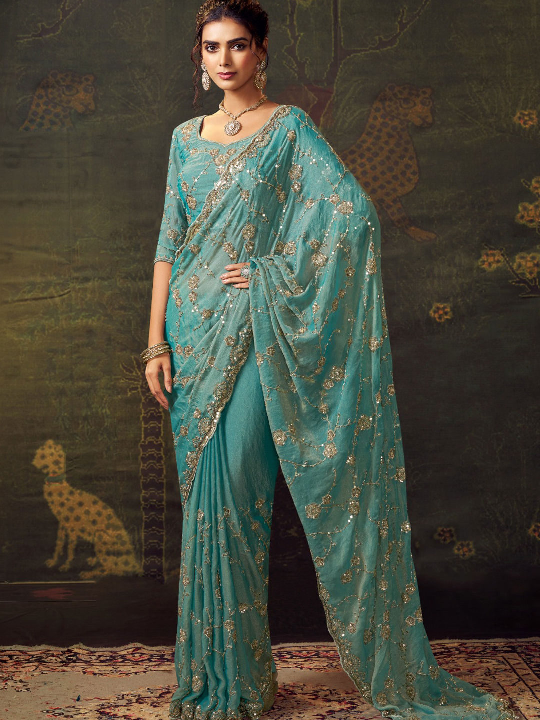 Blue color Saree in Tissue fabric with Embroidered, Sequence, Thread, Zari work
