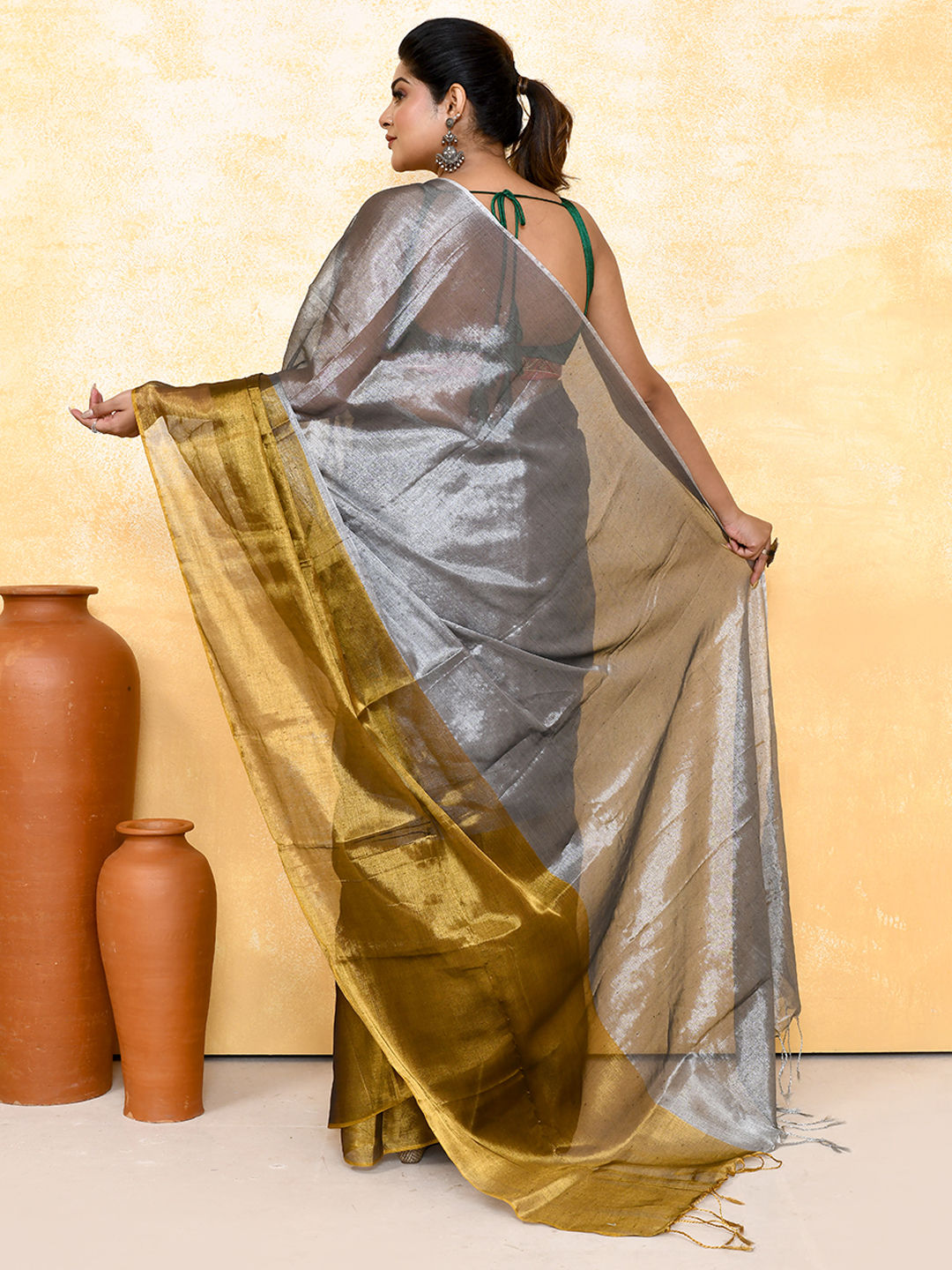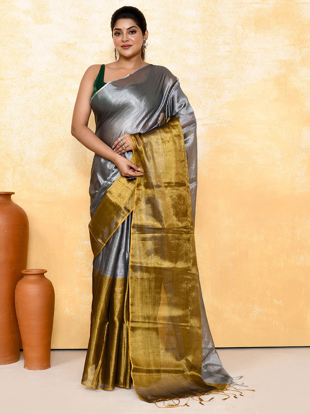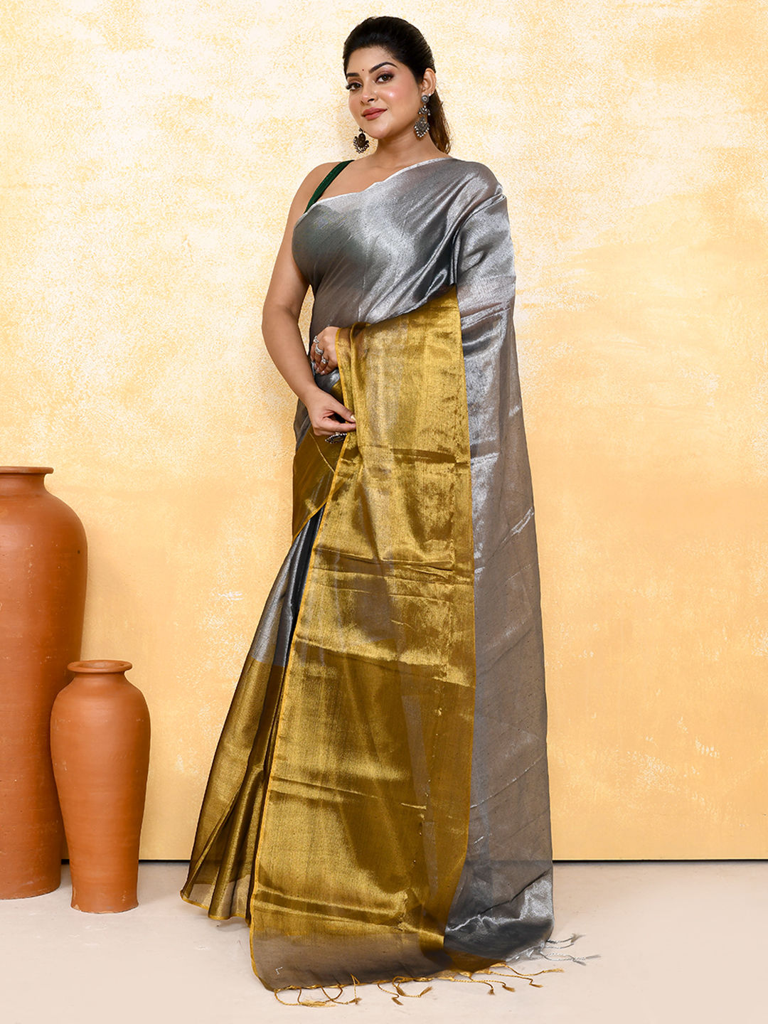 Black and Grey, Gold color Saree in Tissue fabric with Weaving work