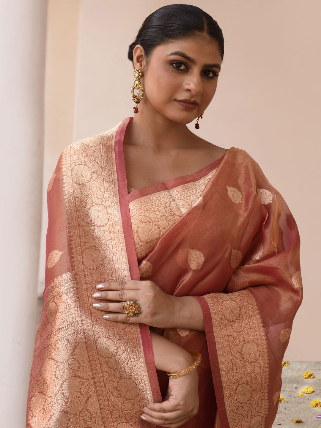 Gold color Saree in Banarasi Silk, Tissue fabric with Border, Zari work