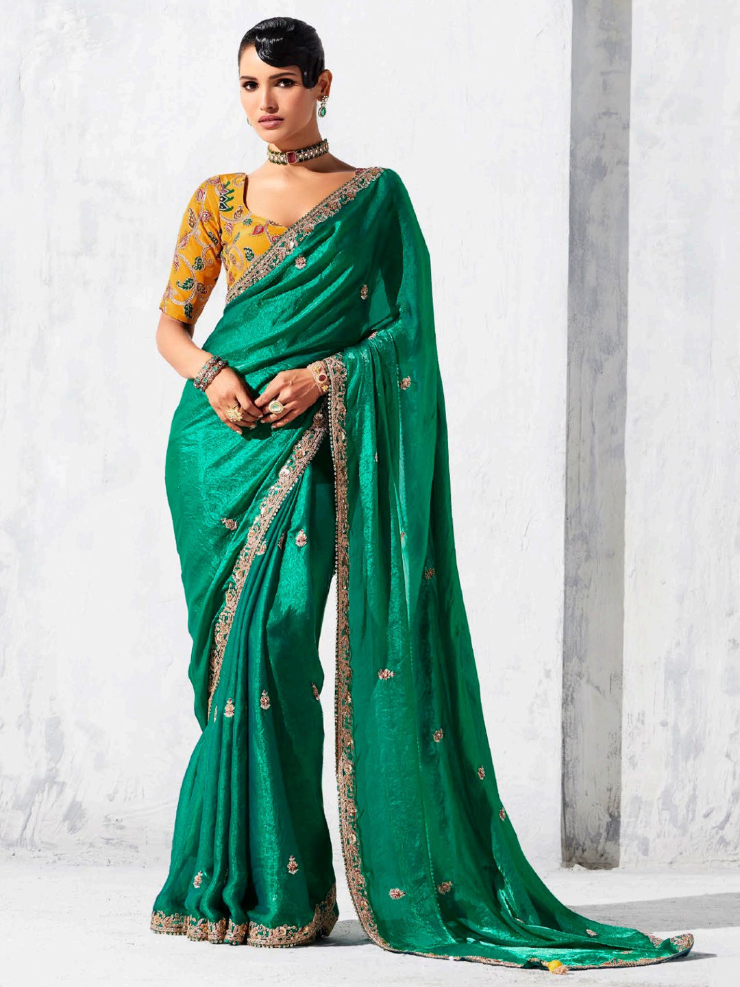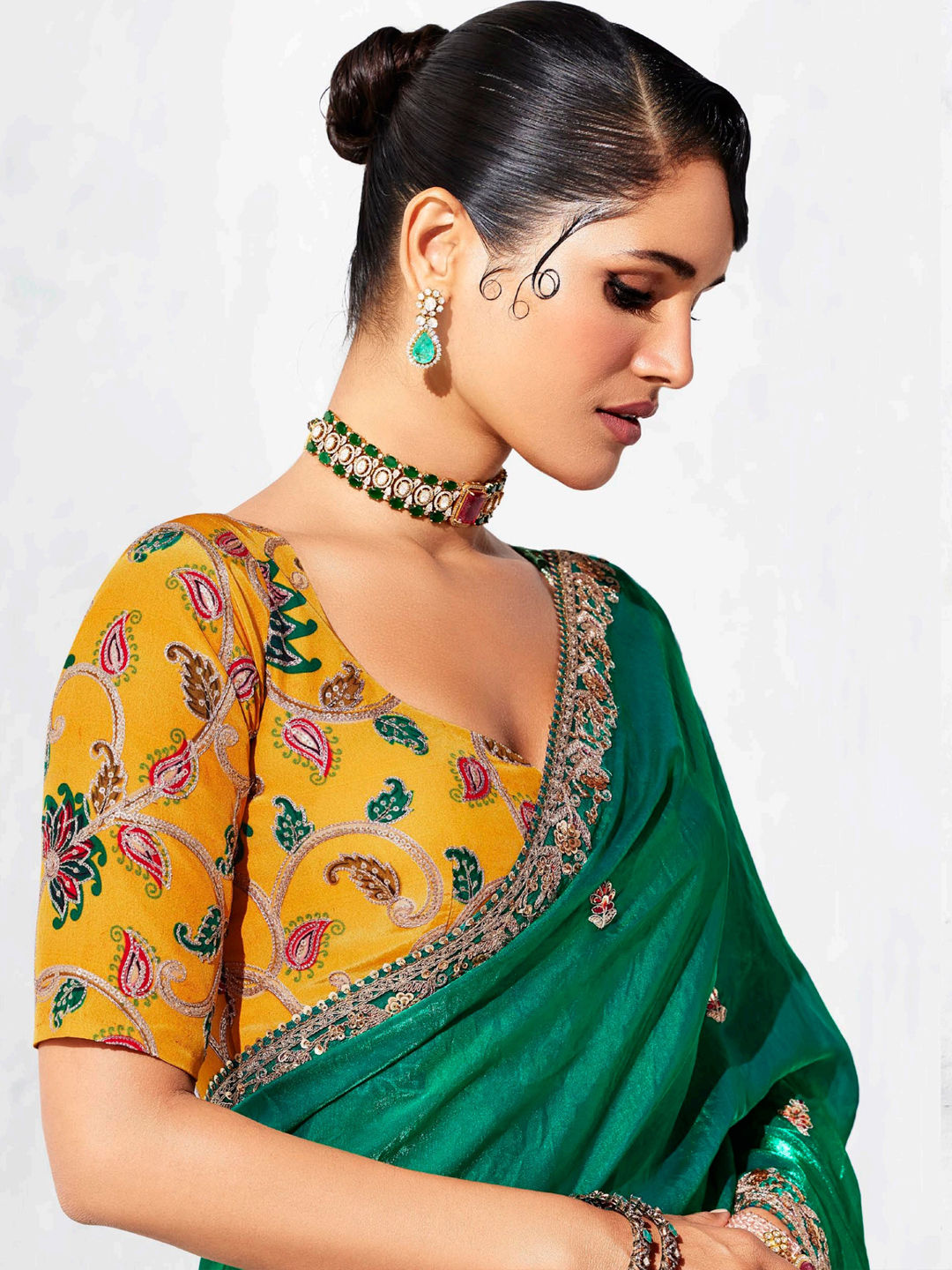 Green color Saree in Tissue fabric with Embroidered, Sequence, Thread, Zari work