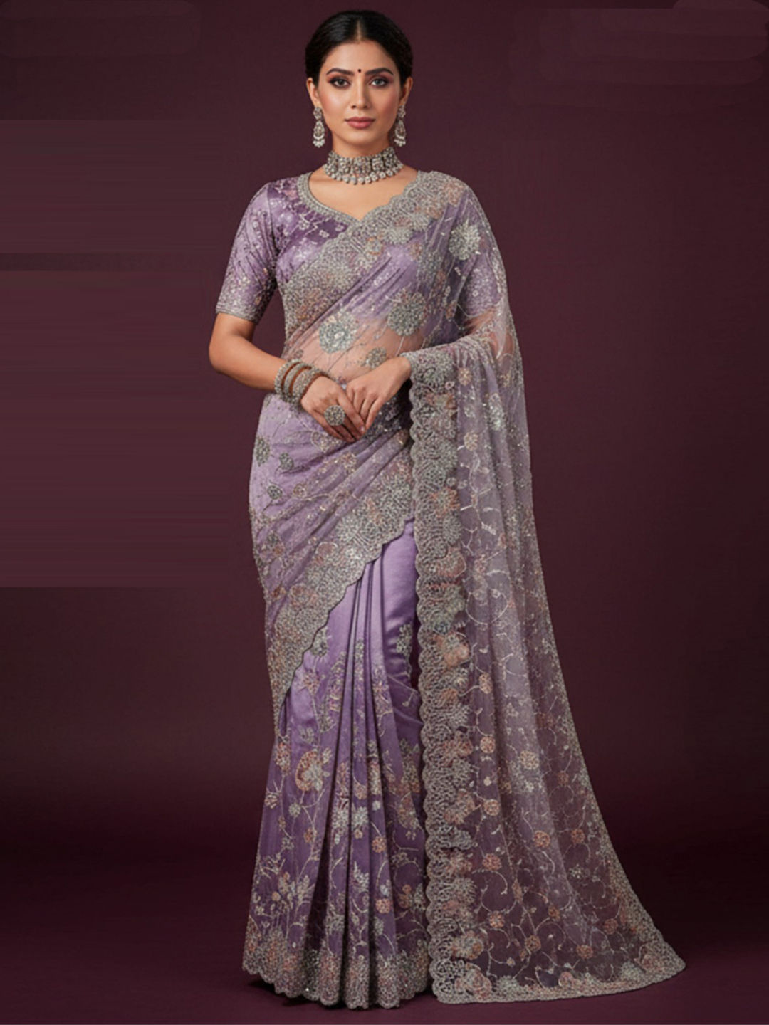 Purple and Violet color Saree in Tissue fabric with Embroidered, Sequence work