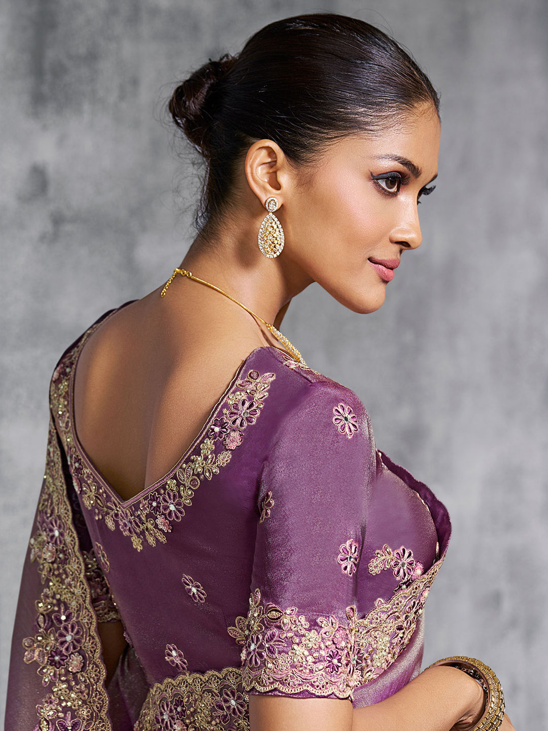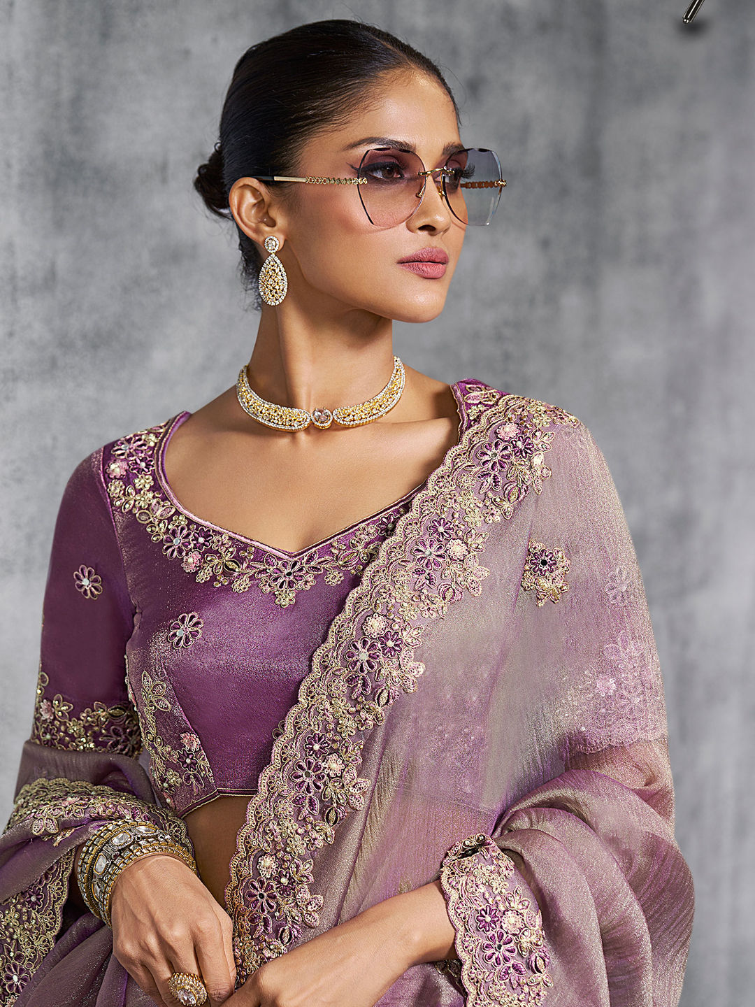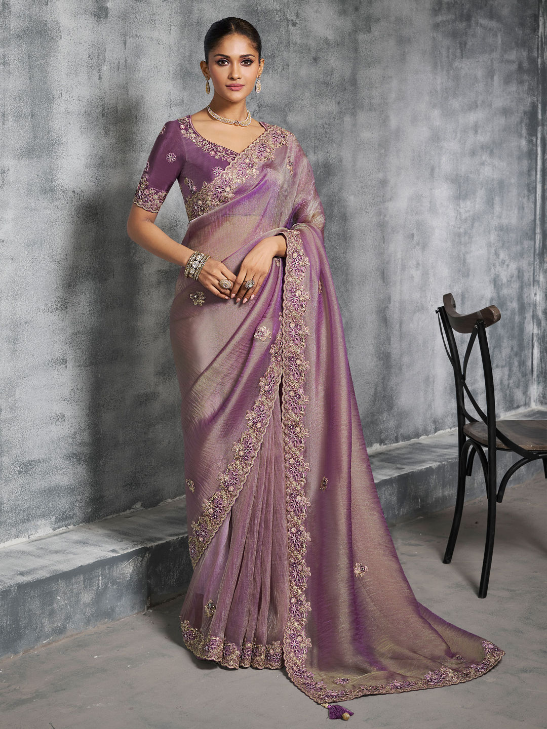 Description: Purple and Violet color Saree in Tissue fabric with Border, Embroidered, Mirror, Resham, Sequence, Stone, Thread, Zari work
