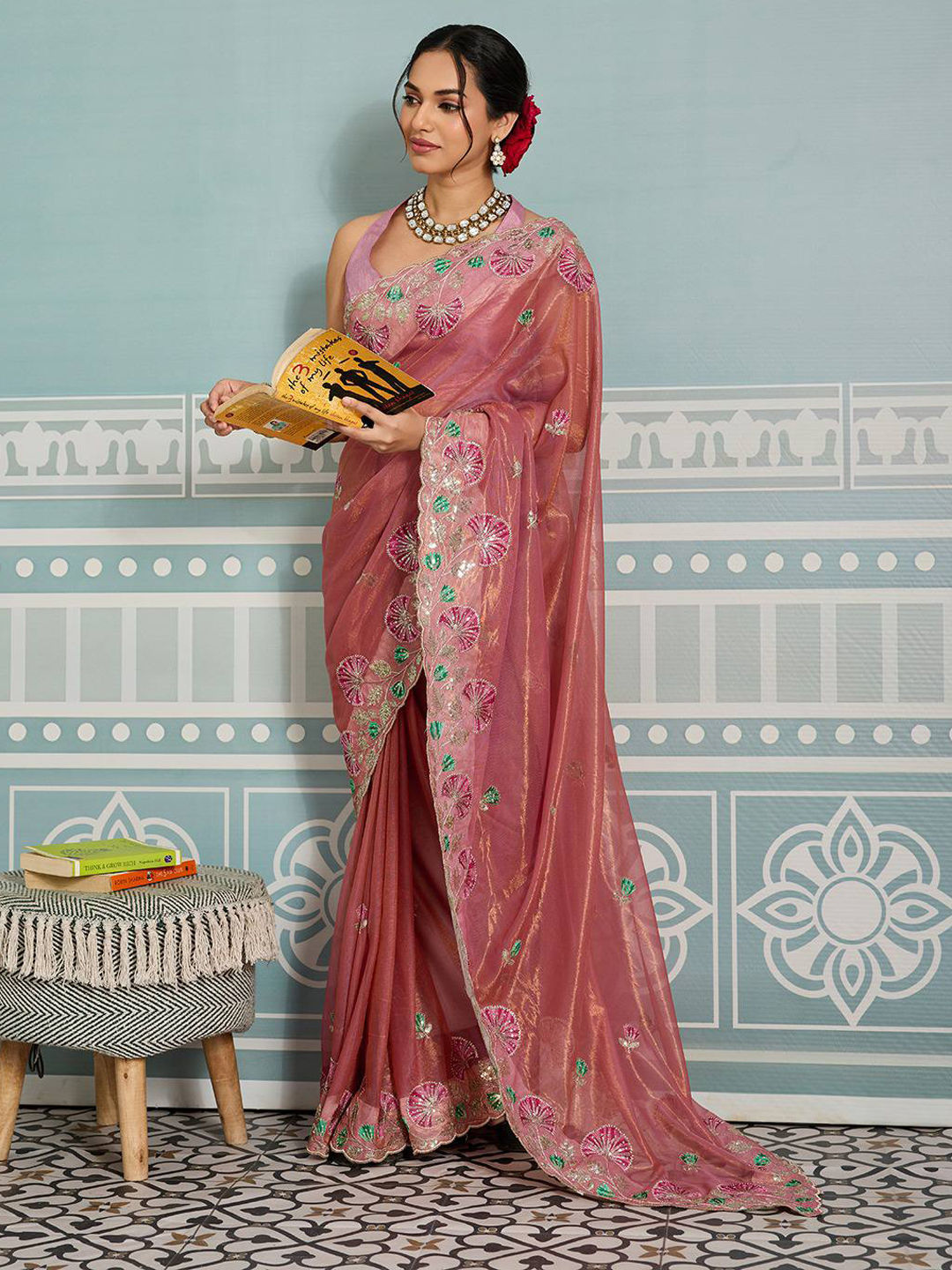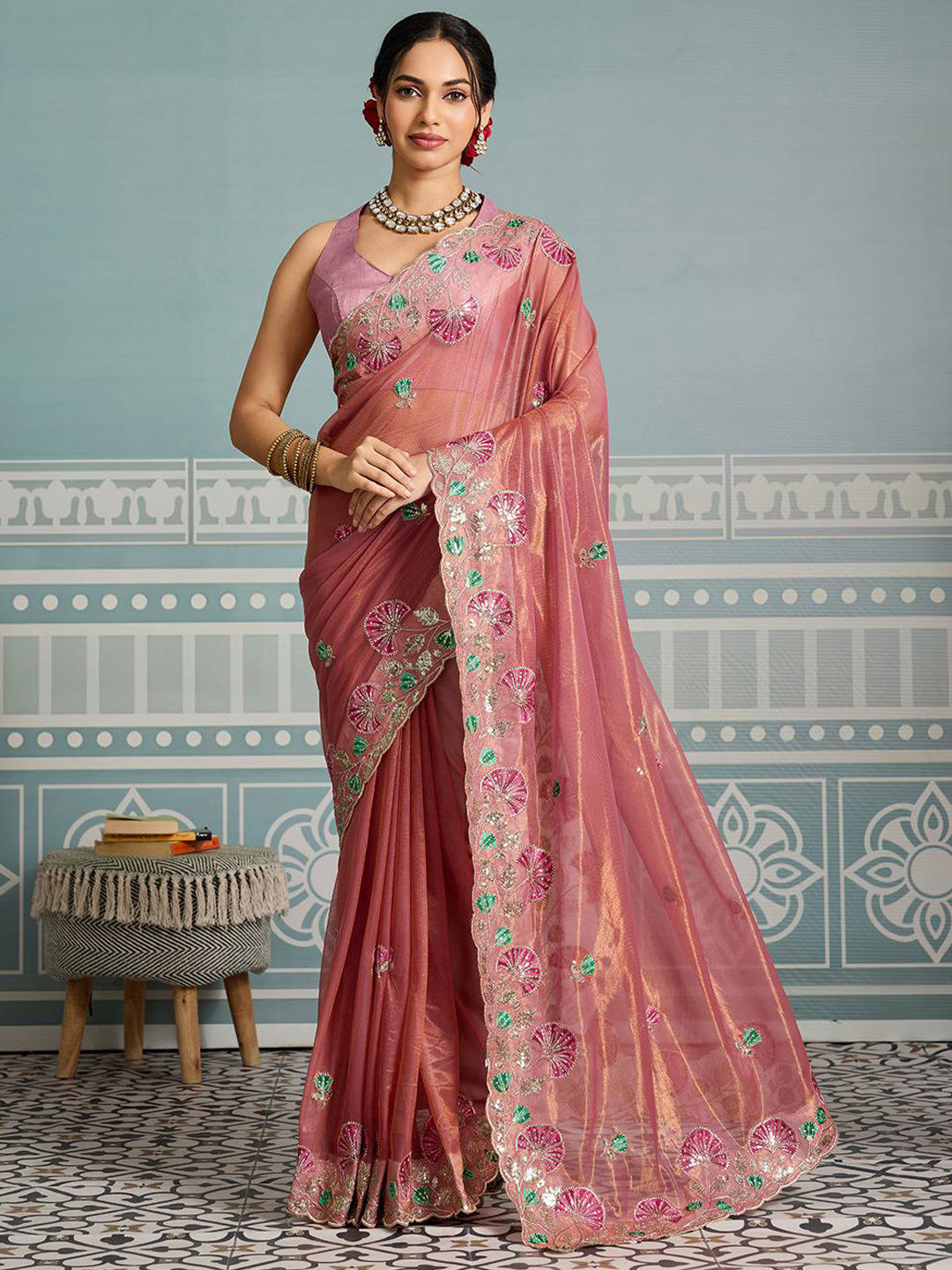 Red and Maroon color Saree in Tissue fabric with Embroidered, Sequence, Thread, Zari work