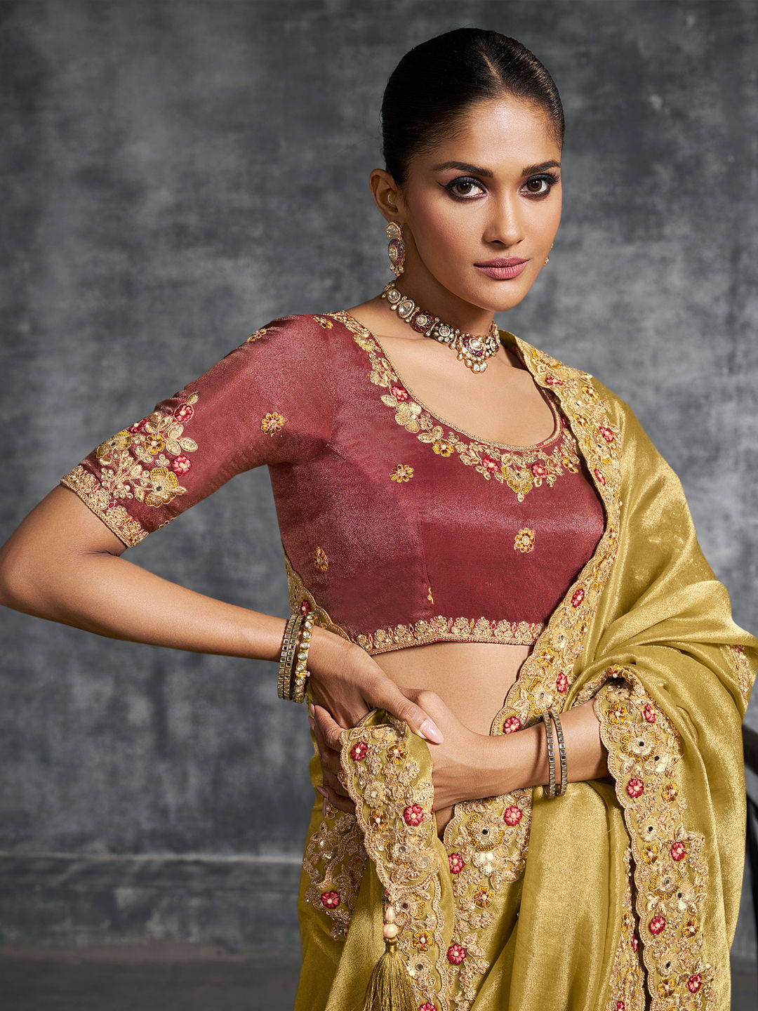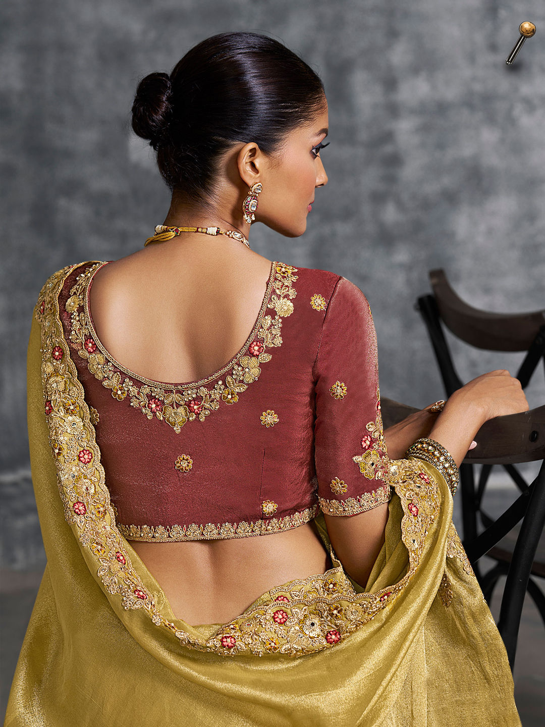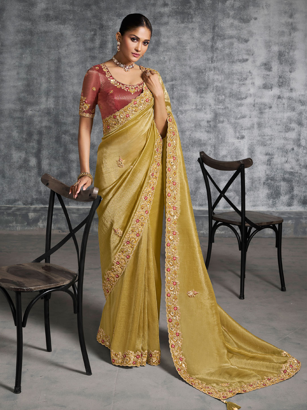 Description: Yellow color Saree in Tissue fabric with Border, Embroidered, Mirror, Resham, Sequence, Stone, Thread, Zari work