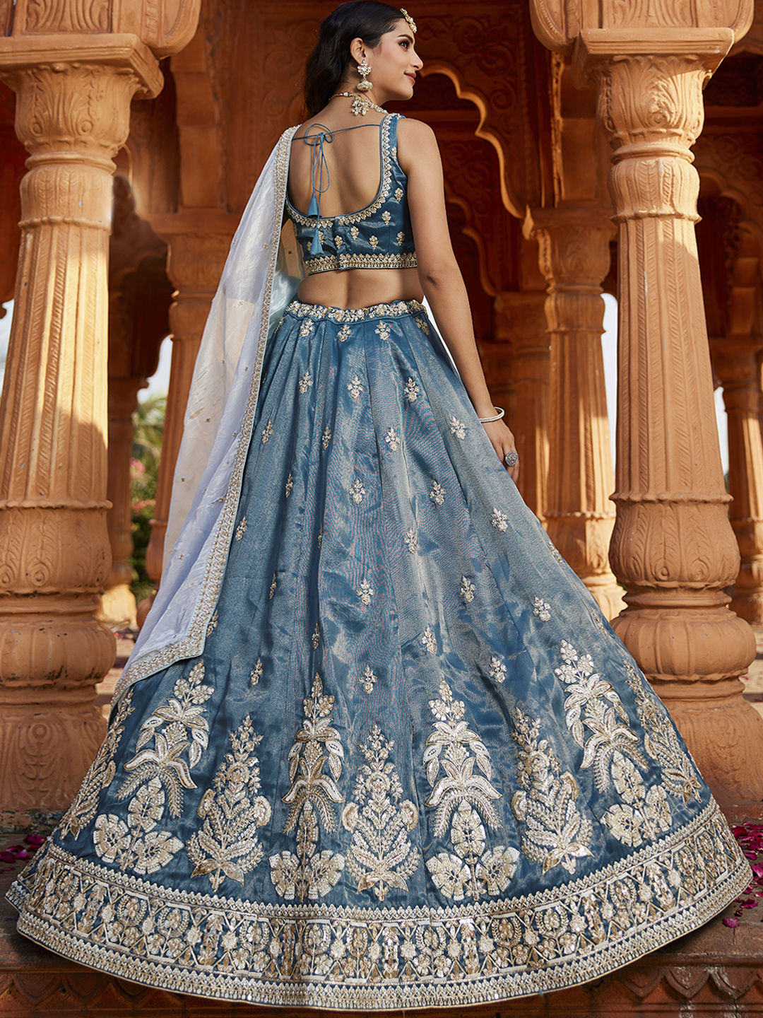Blue color Lehenga in Tissue fabric with Bugle Beads, Embroidered, Sequence, Stone, Thread work