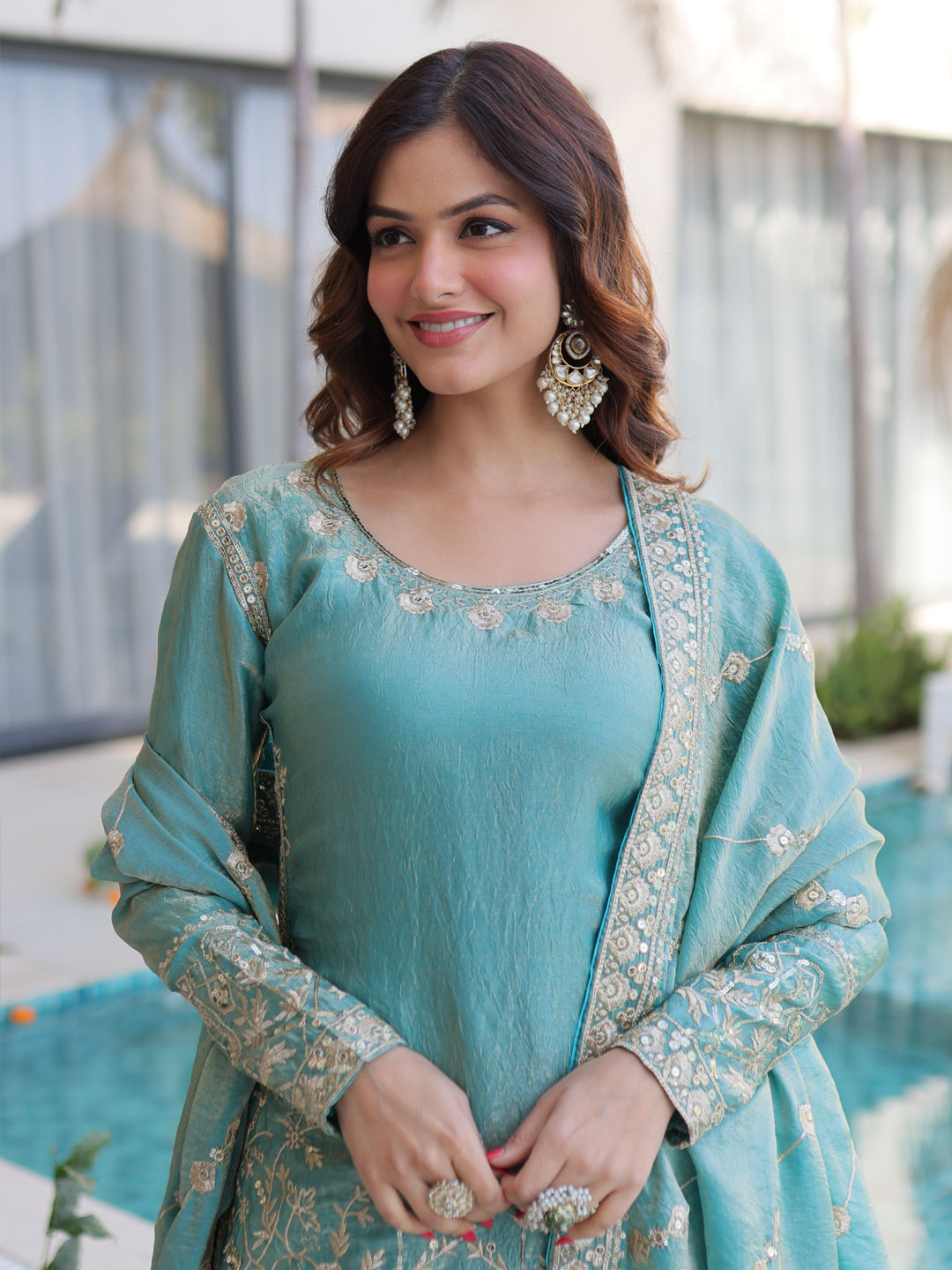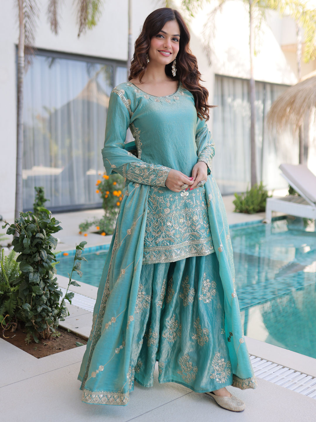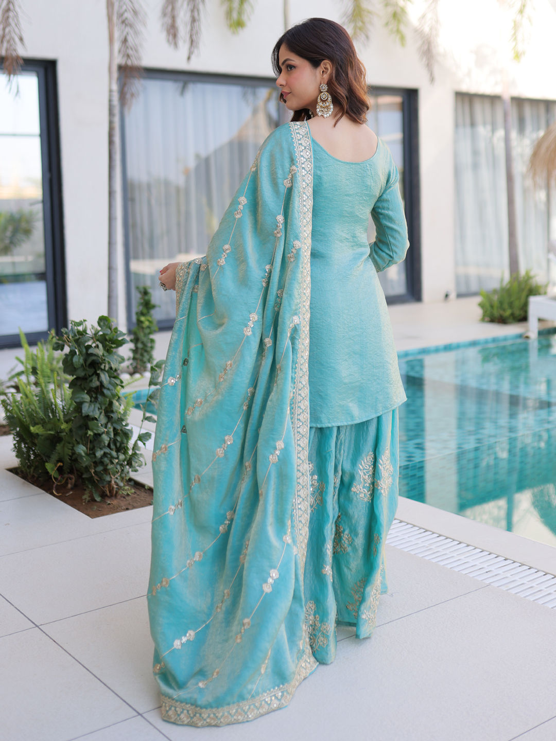 Blue color Salwar Kameez in Tissue fabric with Embroidered, Sequence, Thread, Zari work