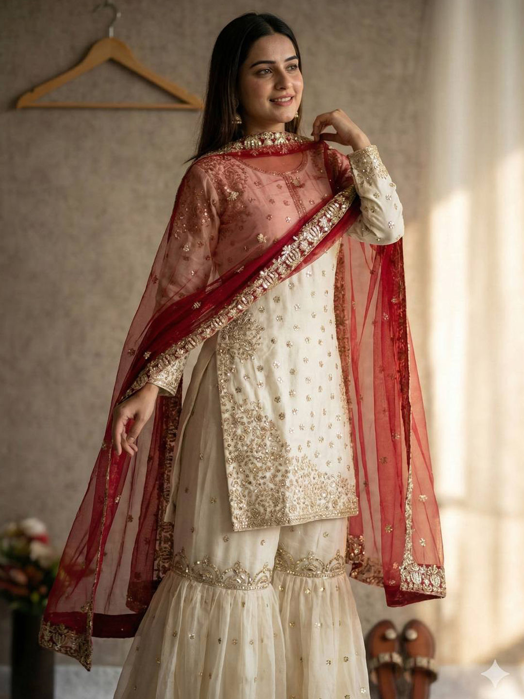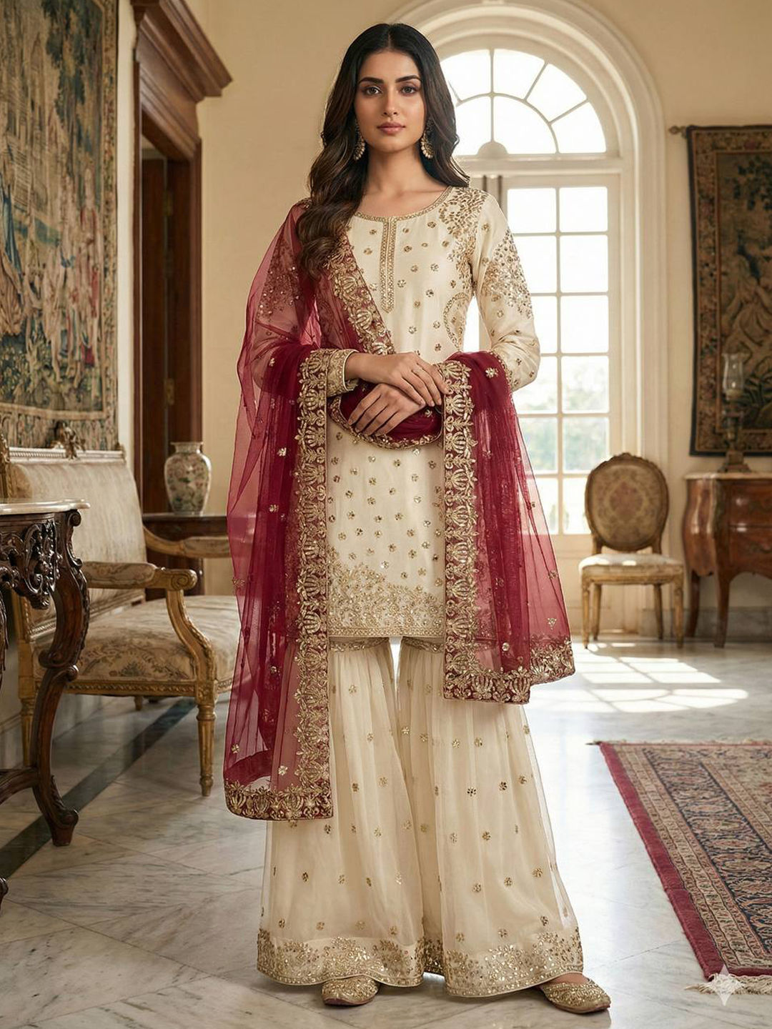 Red and Maroon, White and Off White color Salwar Kameez in Tissue fabric with Embroidered, Sequence, Thread work