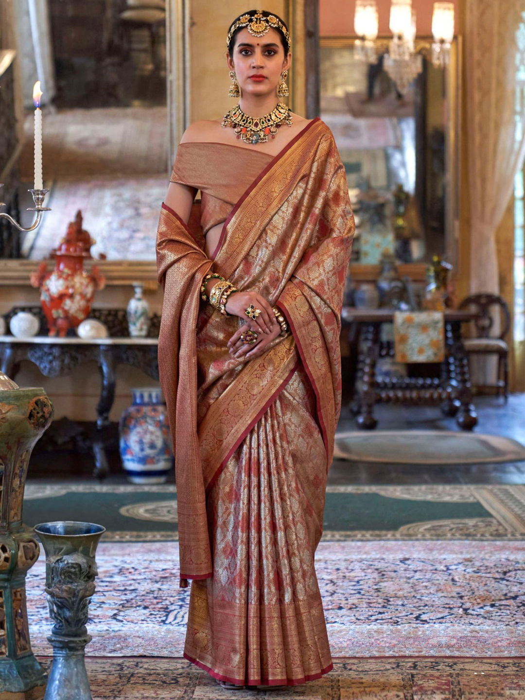 Beige and Brown color Saree in Tissue fabric with Weaving work