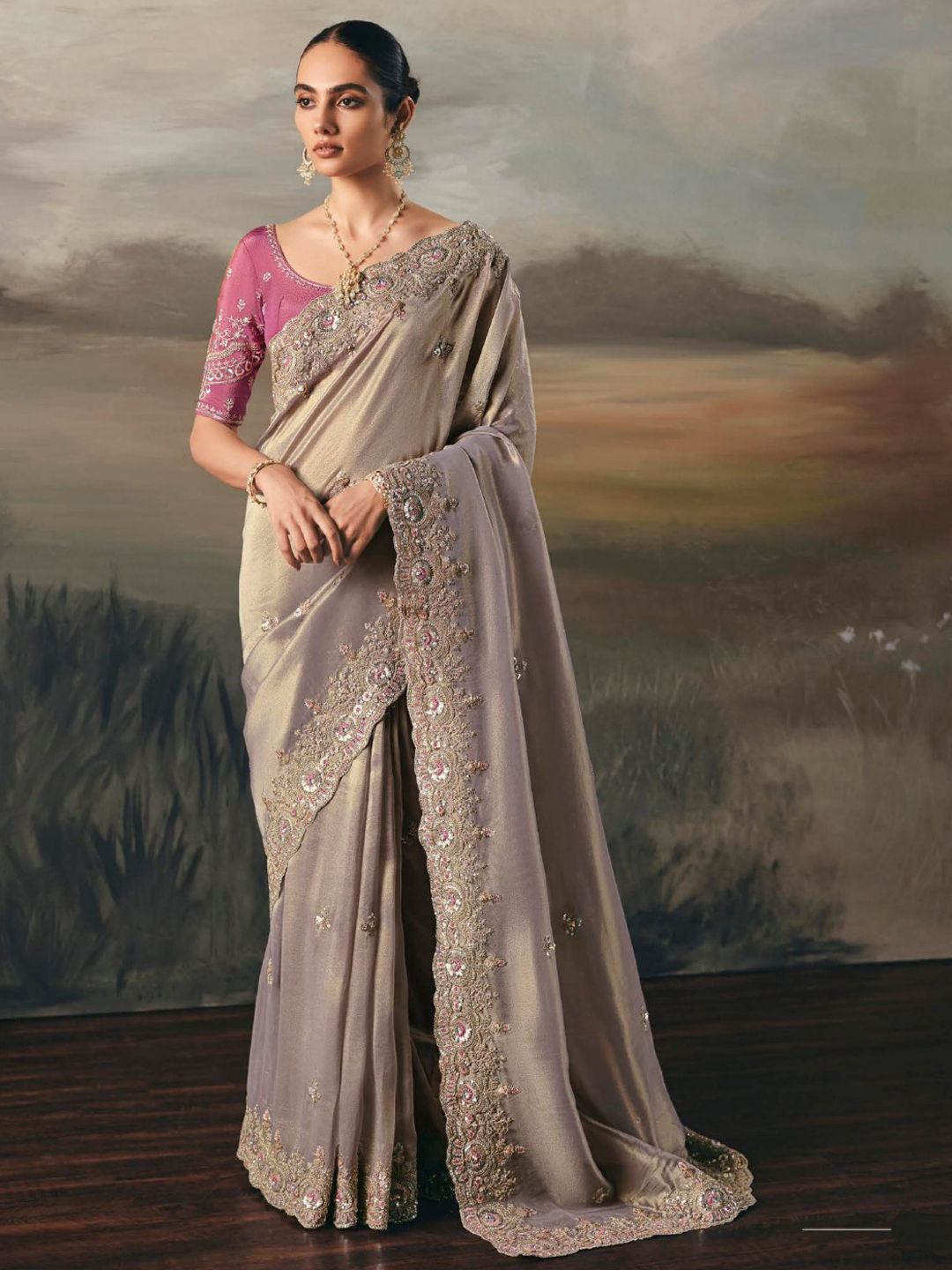 Beige and Brown color Saree in Tissue fabric with Embroidered, Sequence, Thread, Zari work