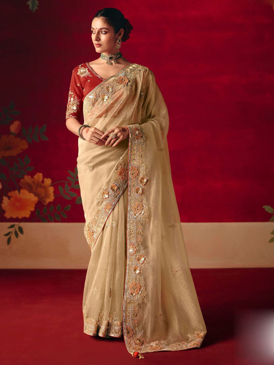 Beige and Brown color Saree in Tissue fabric with Embroidered, Sequence, Stone, Thread, Zari work