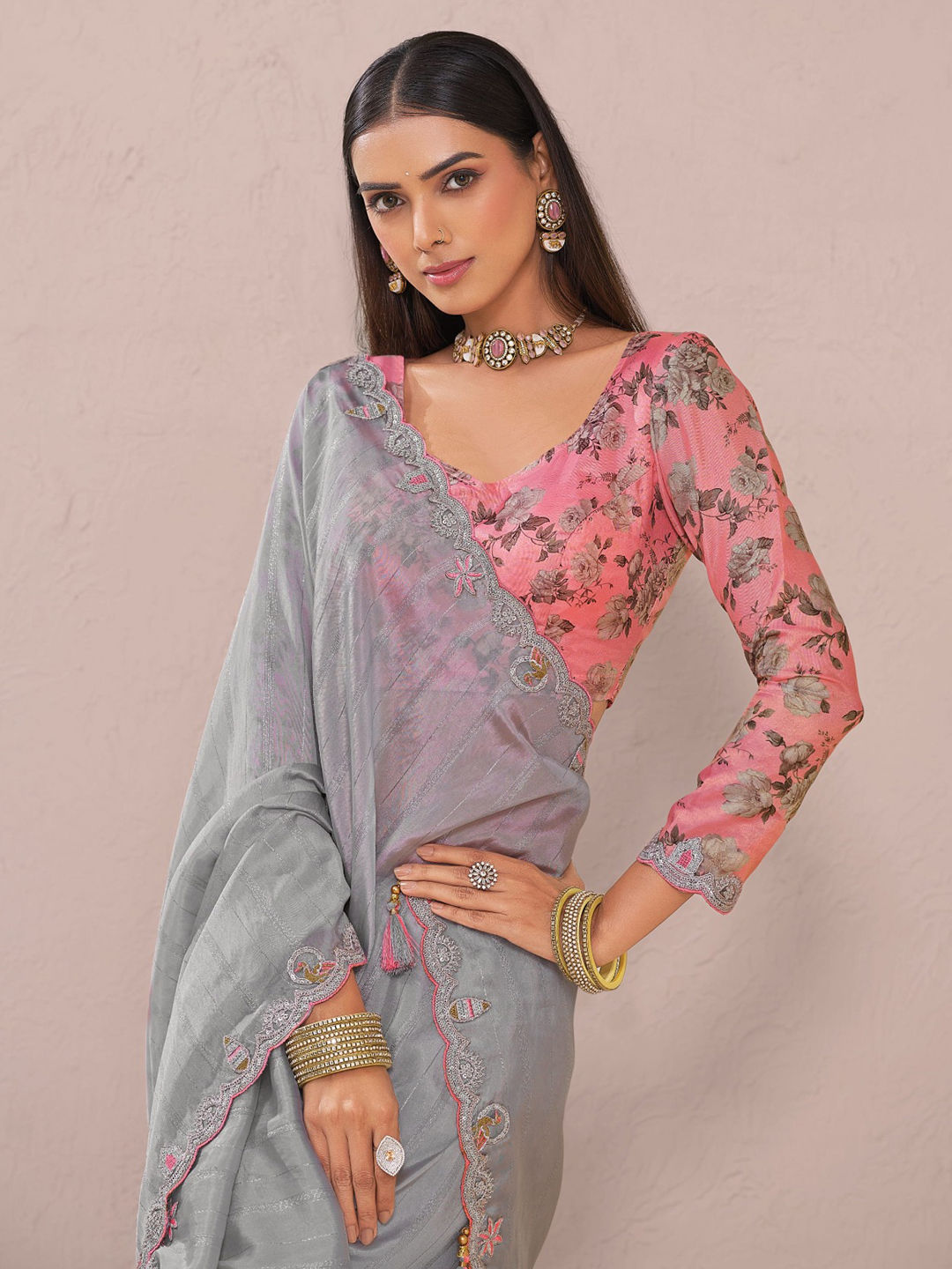 Black and Grey color Saree in Tissue fabric with Embroidered, Lace, Resham, Thread work