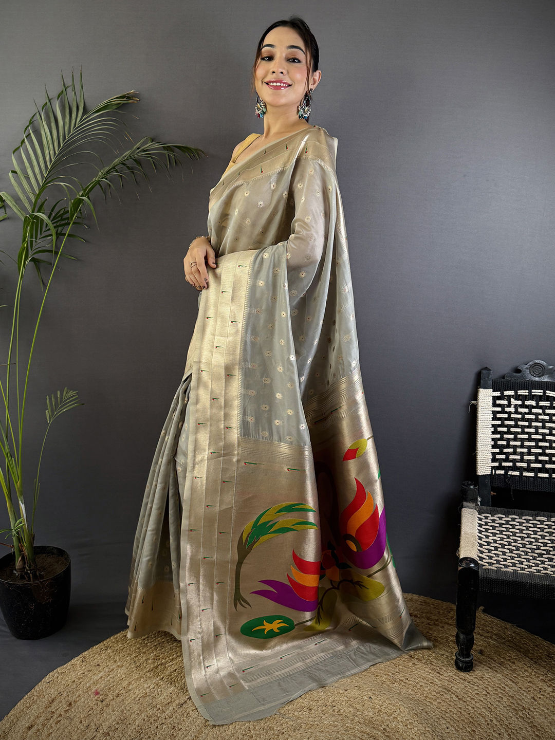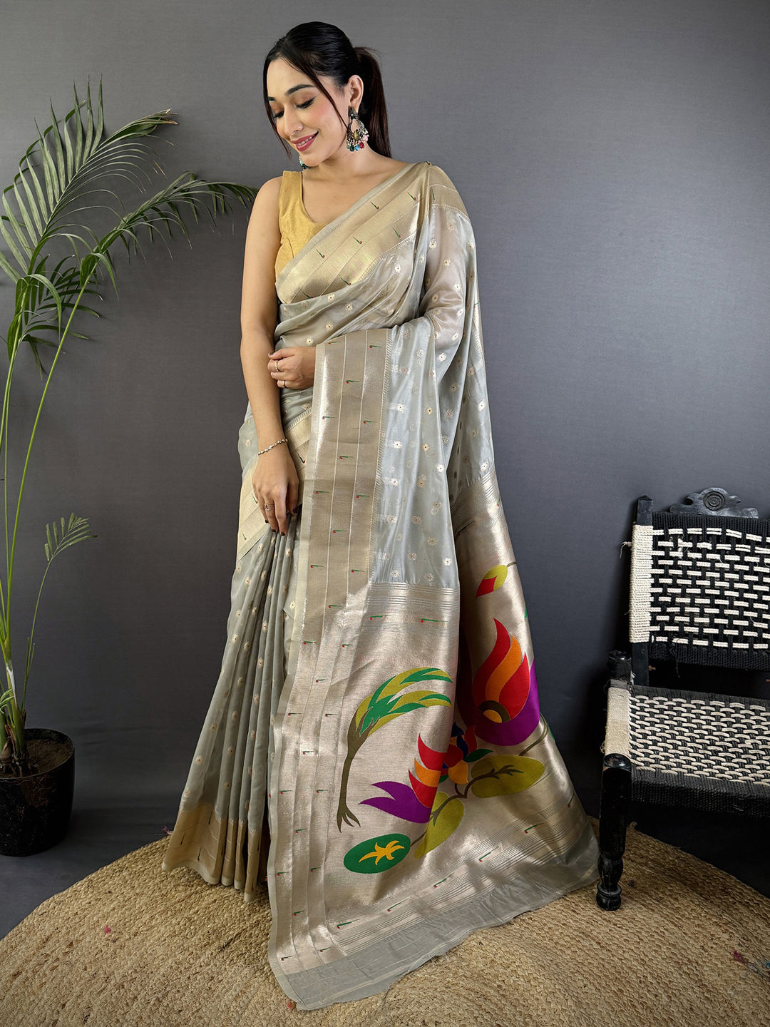 Black and Grey color Saree in Tissue fabric with Weaving work