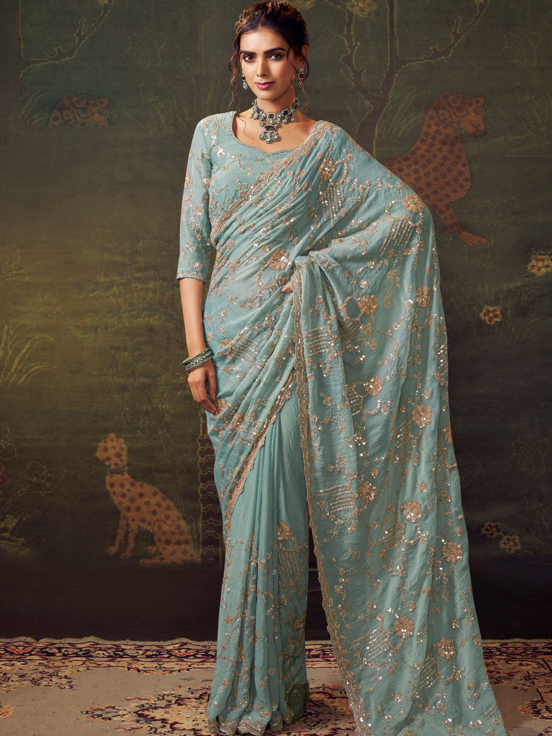Blue color Saree in Tissue fabric with Embroidered, Sequence, Thread, Zari work