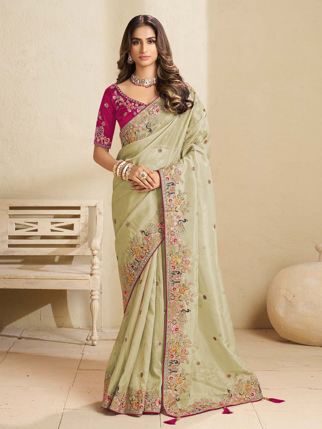 Tissue Bridal Saree in Pink and Majenta with Embroidered work