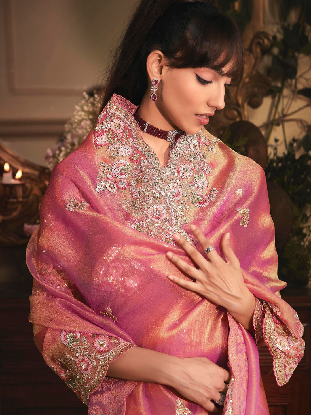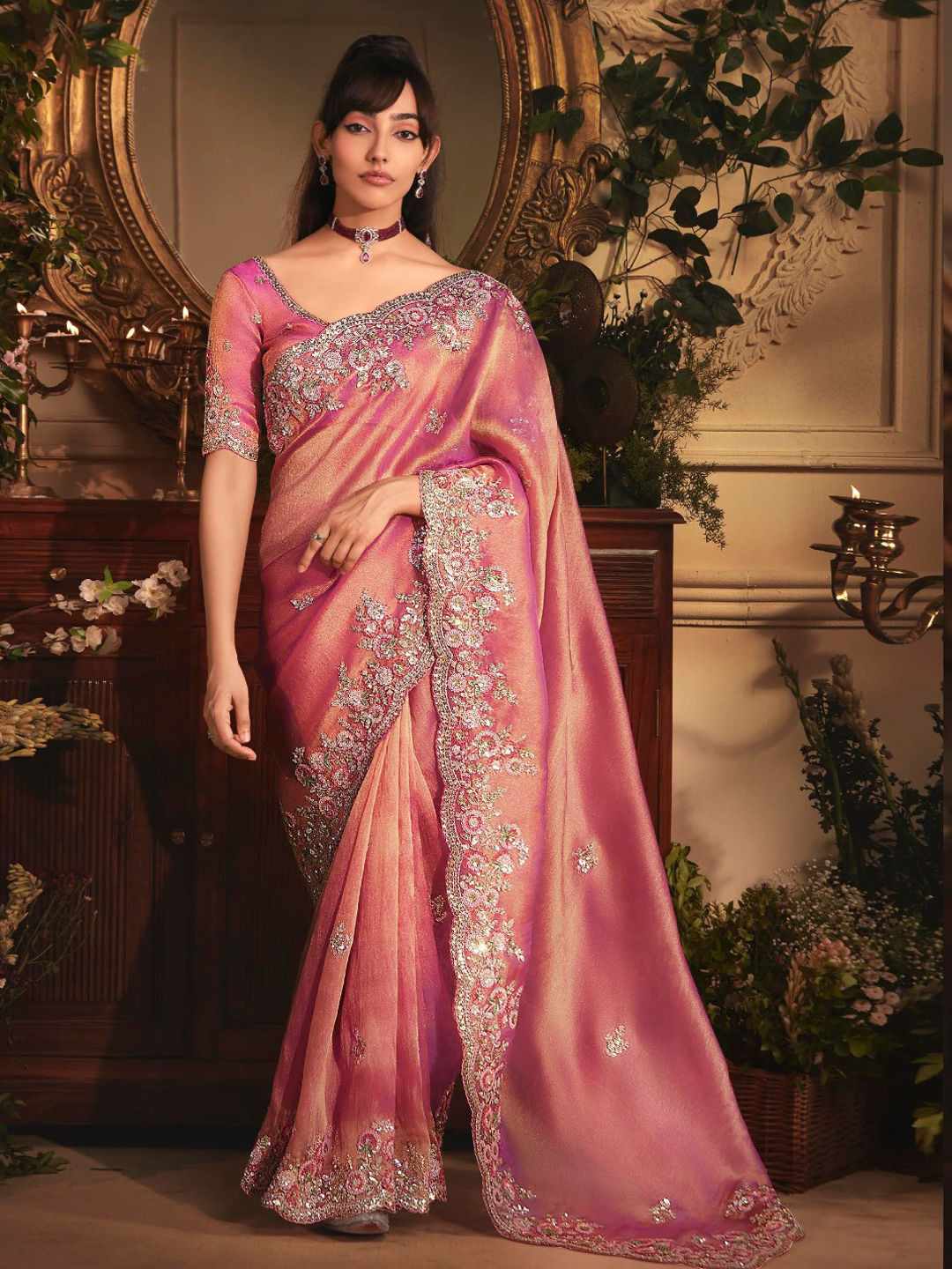 Tissue Bridal Saree in Pink and Majenta with Embroidered work