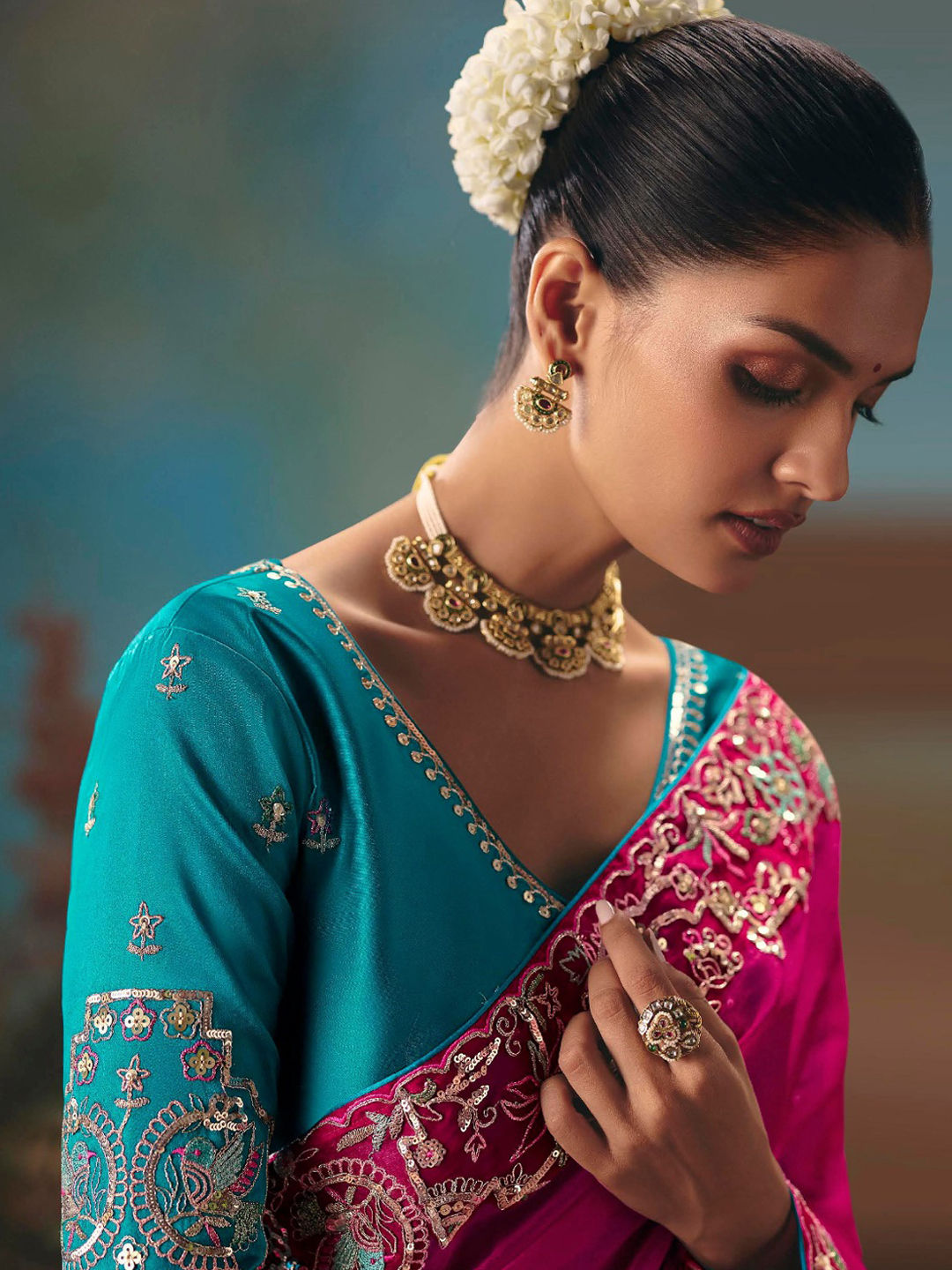 Pink and Majenta color Saree in Tissue fabric with Border, Embroidered, Sequence work