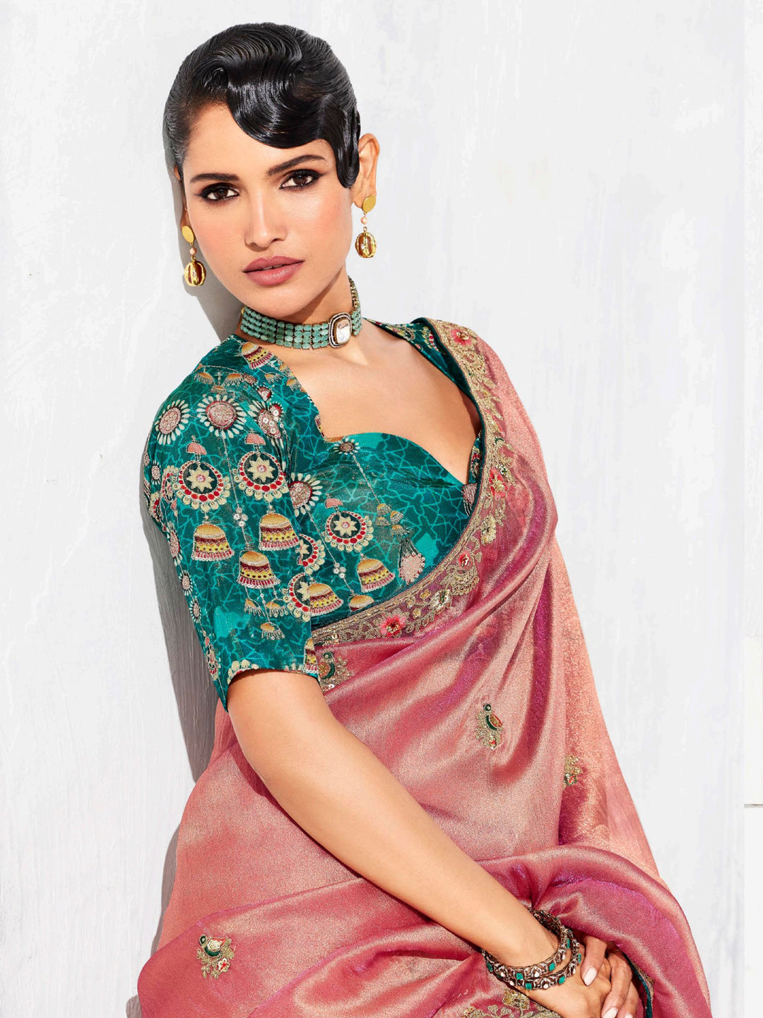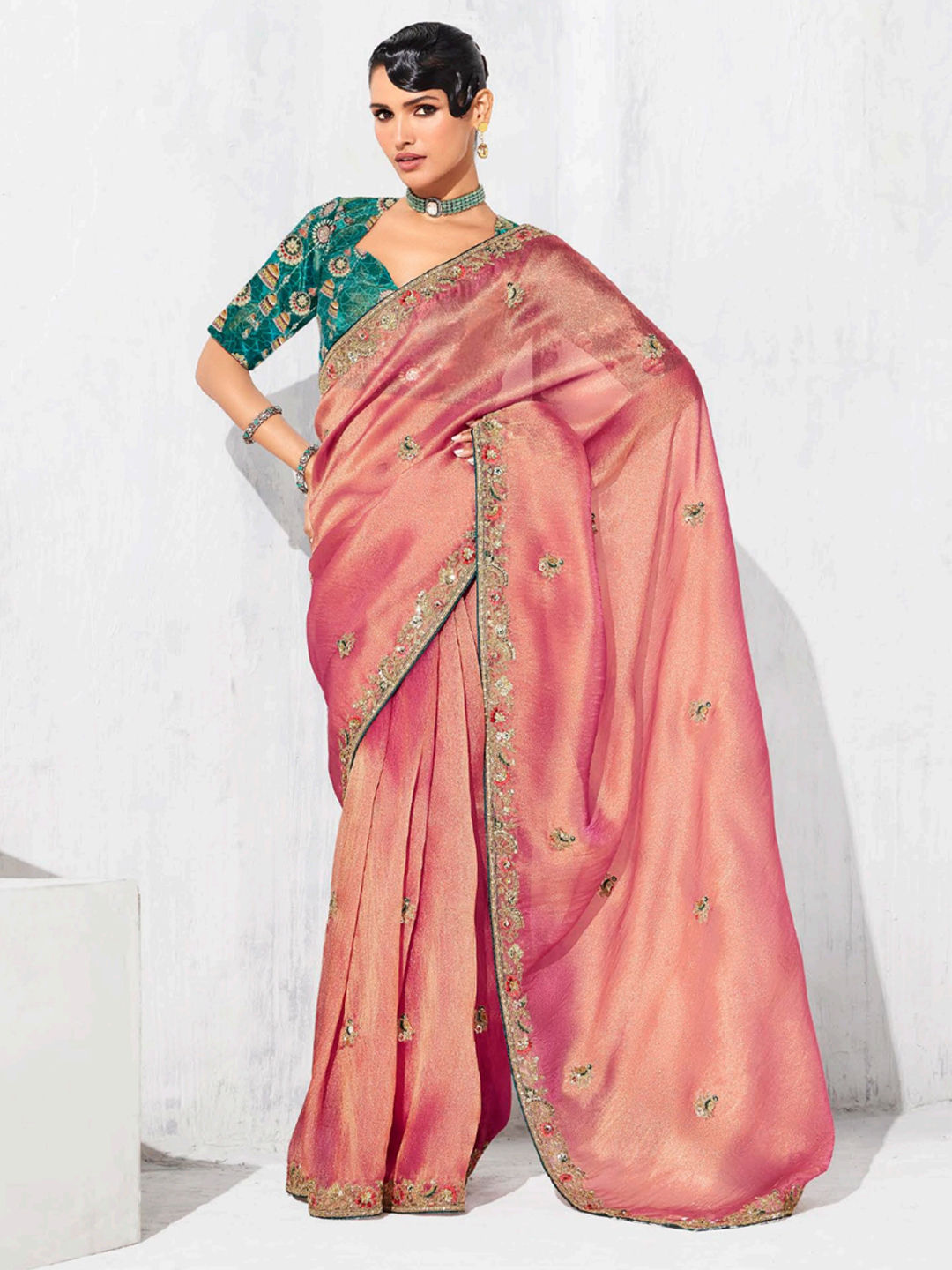 Pink and Majenta color Saree in Tissue fabric with Embroidered, Sequence, Thread, Zari work