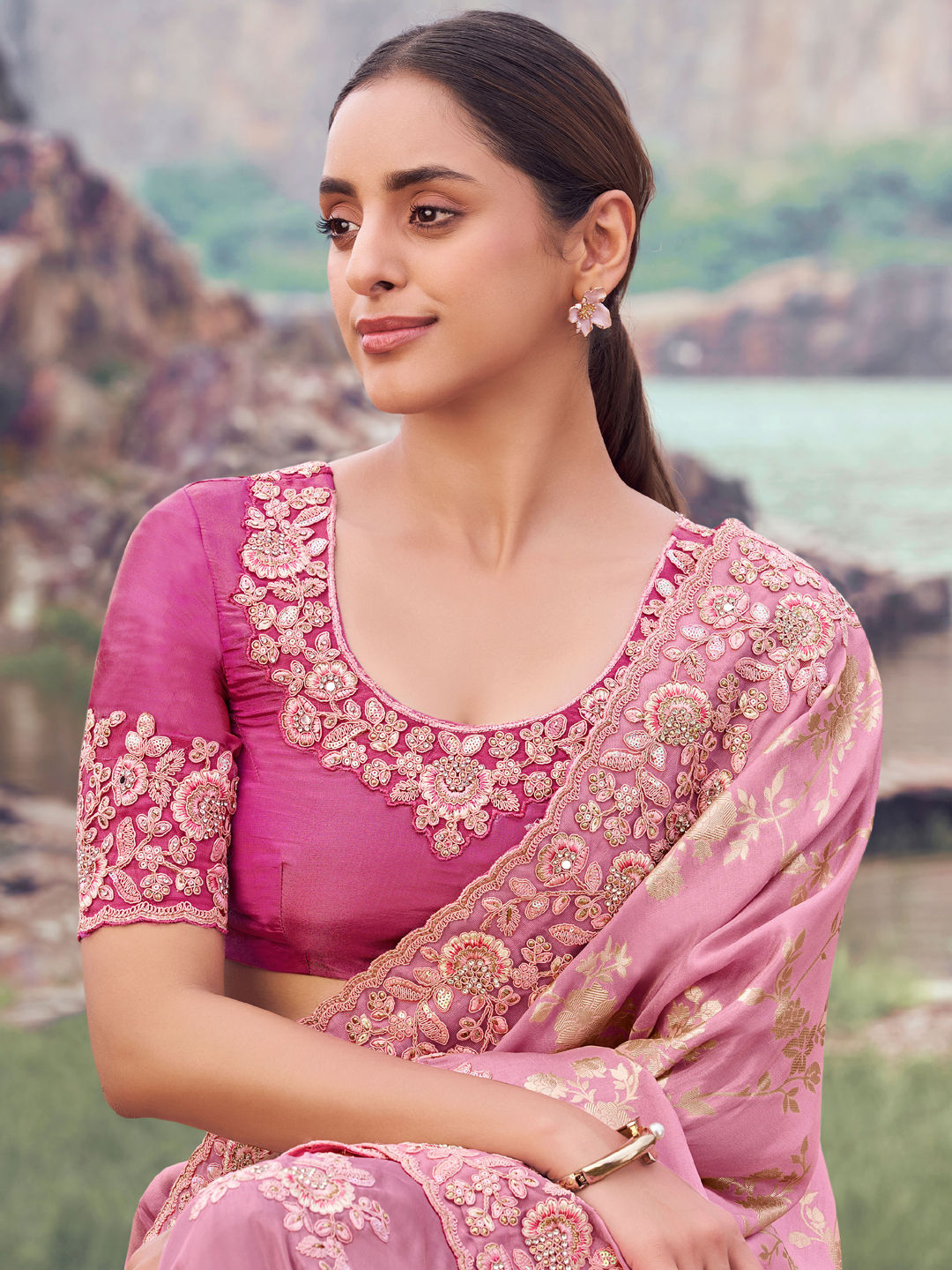 Pink and Majenta color Saree in Jacquard, Tissue fabric with Embroidered, Resham, Sequence, Weaving, Zari work