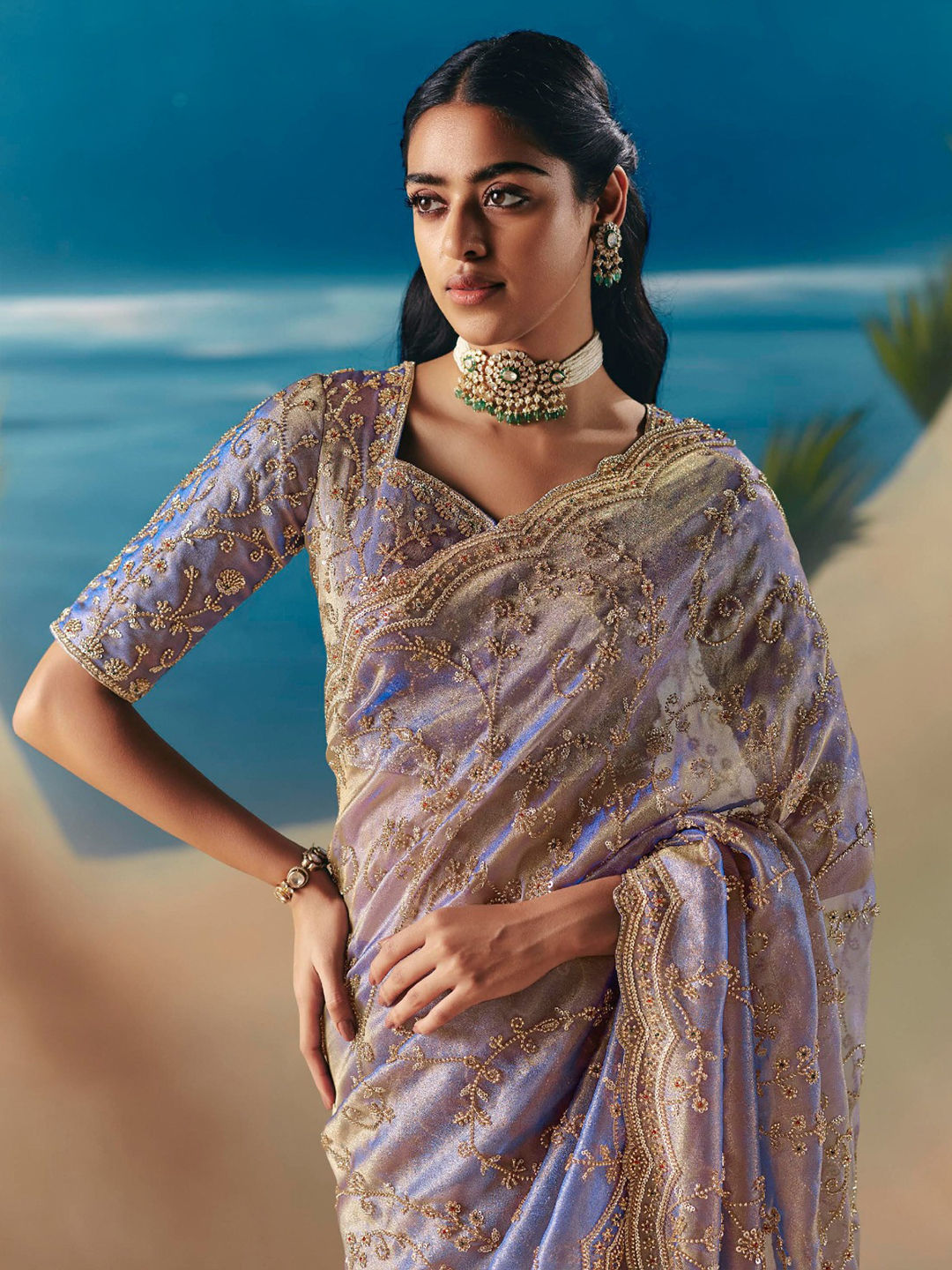 Purple and Violet color Saree in Tissue fabric with Cut Dana, Sequence work