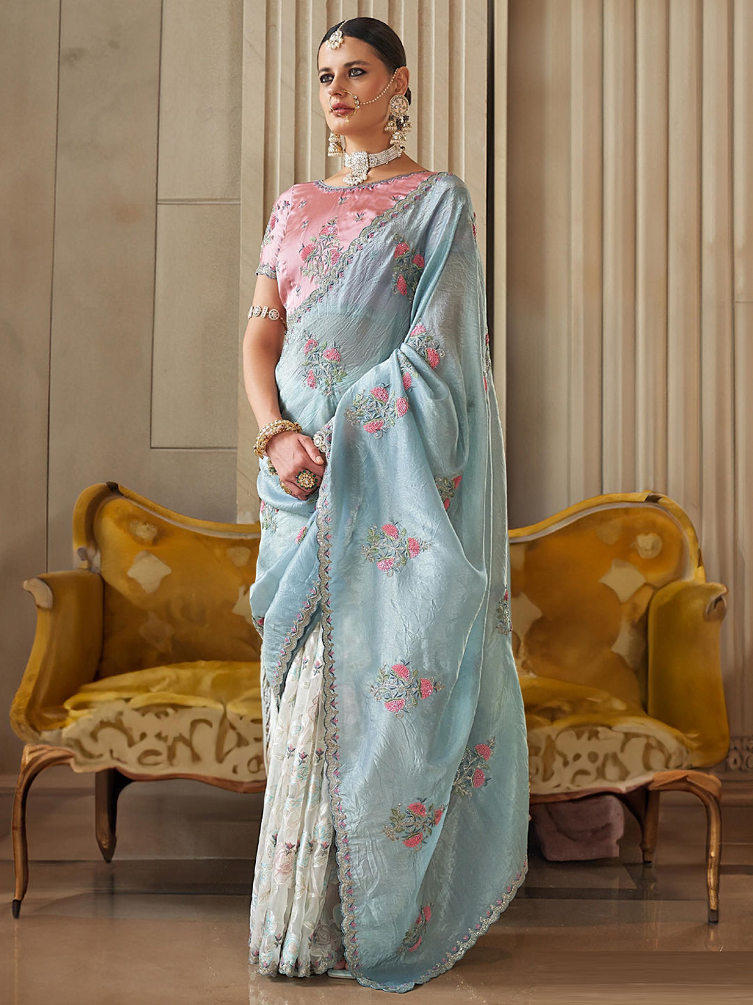 Blue, White and Off White color Saree in Tissue fabric with Embroidered, Sequence, Thread work