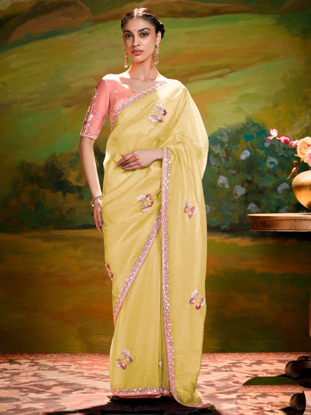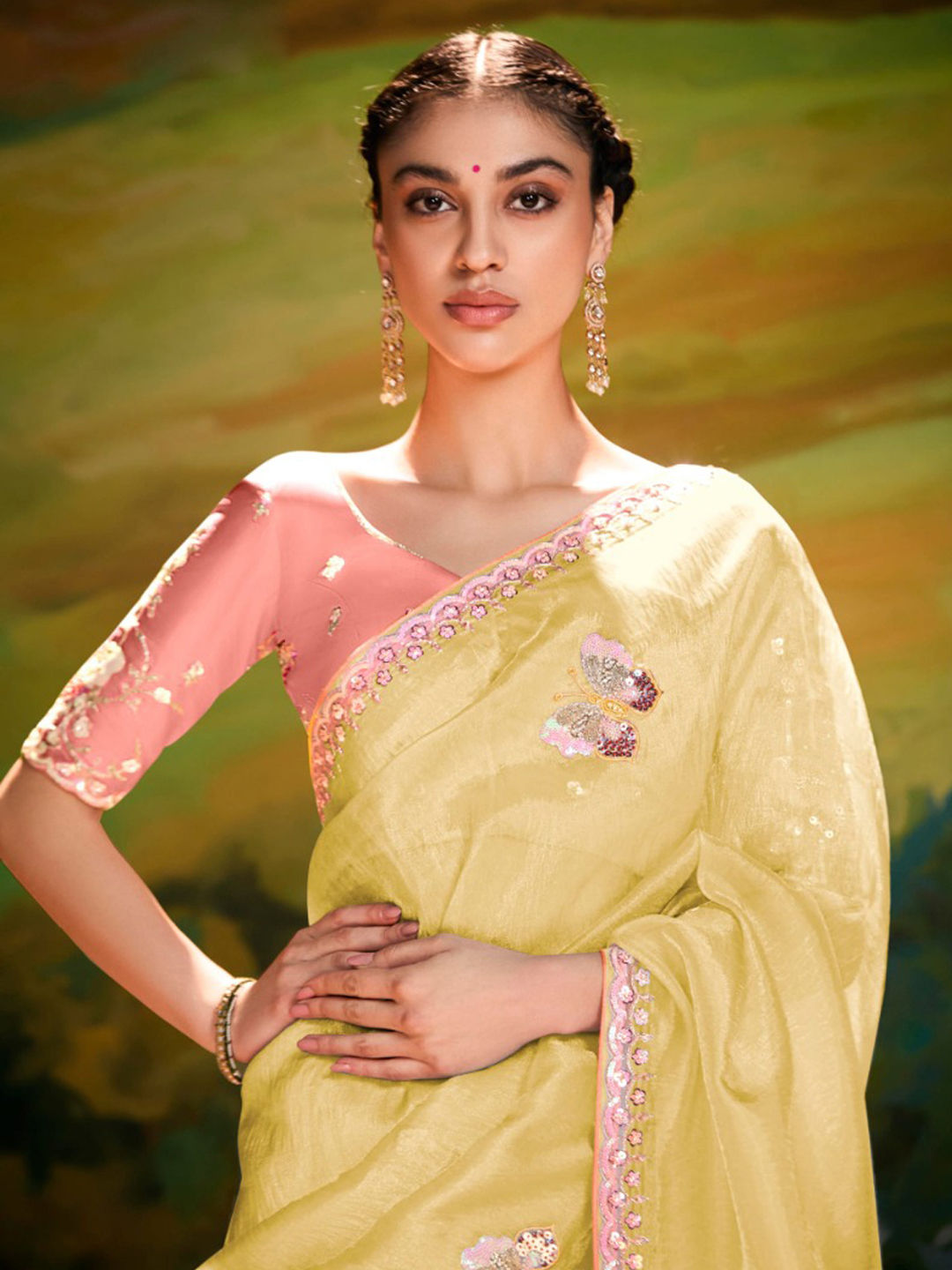 Yellow color Saree in Tissue fabric with Embroidered, Sequence, Thread work