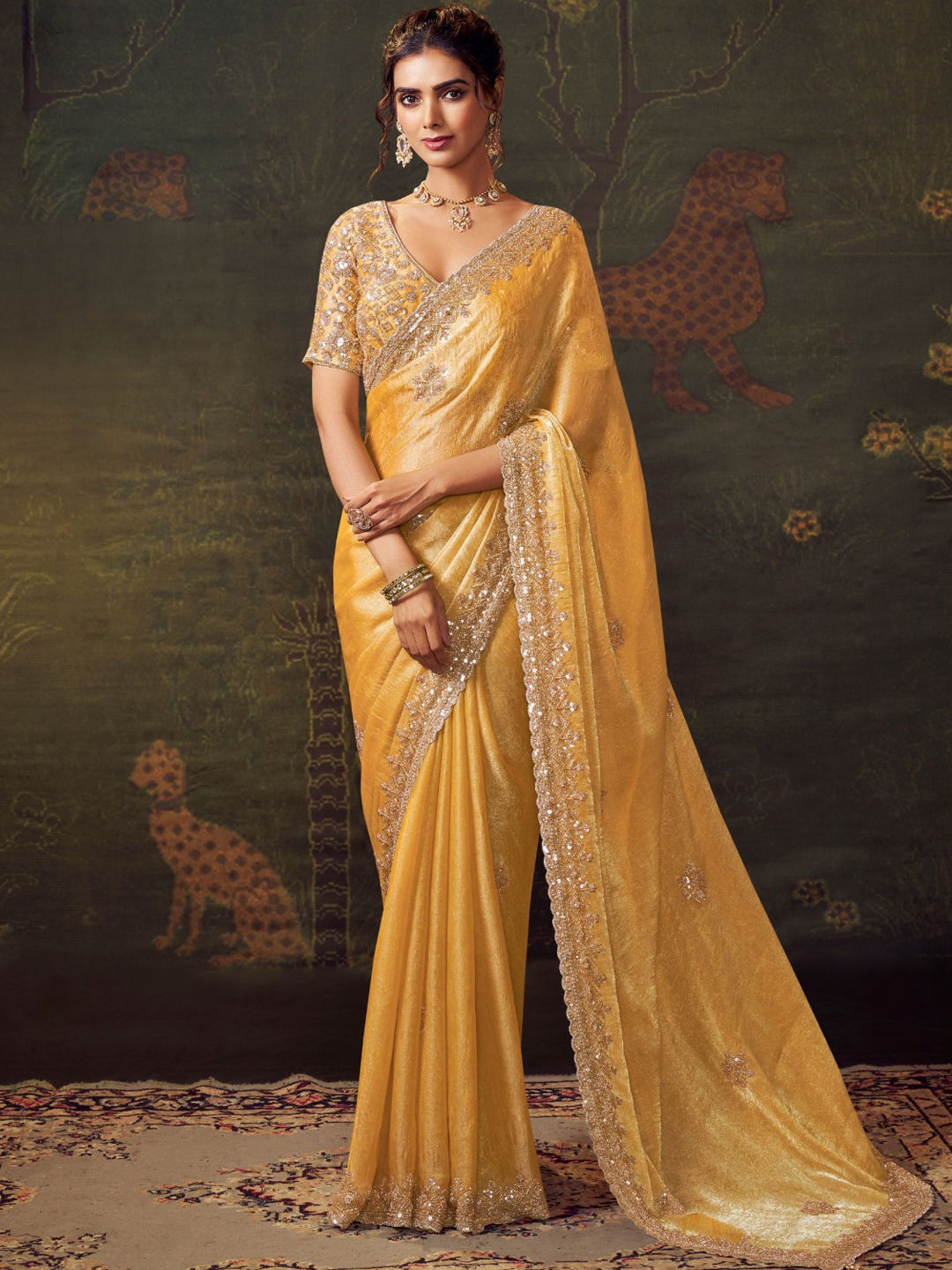 Yellow color Saree in Tissue fabric with Embroidered, Sequence, Thread, Zari work