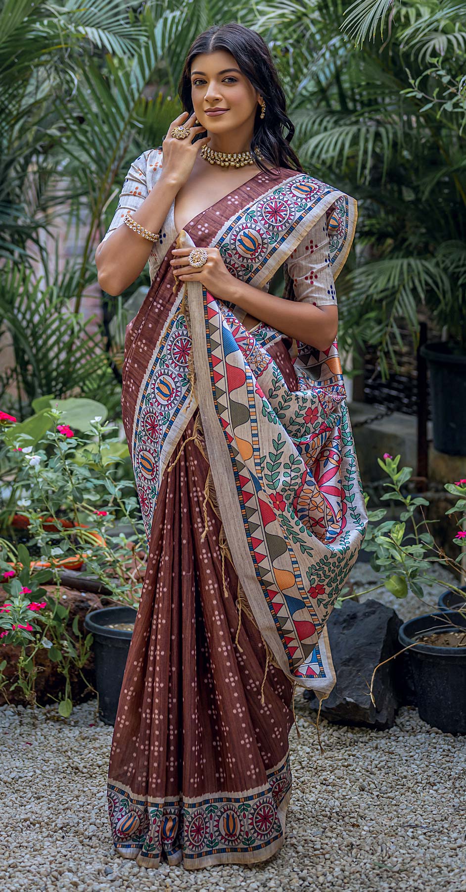 in Beige and Brown with Printed work