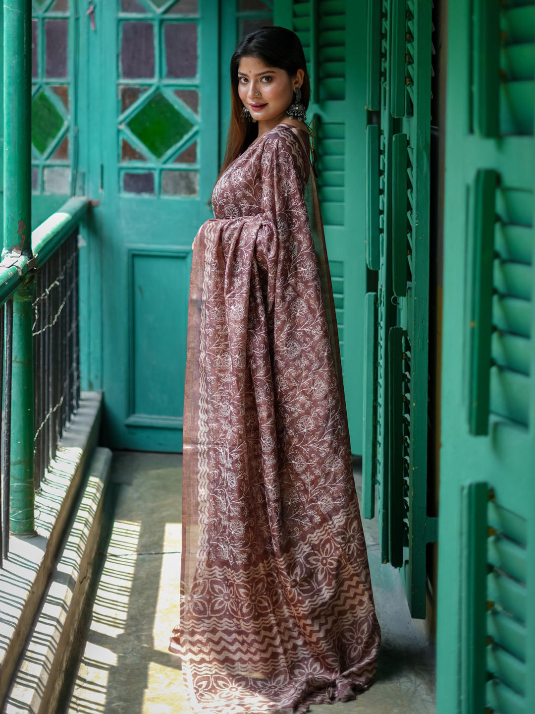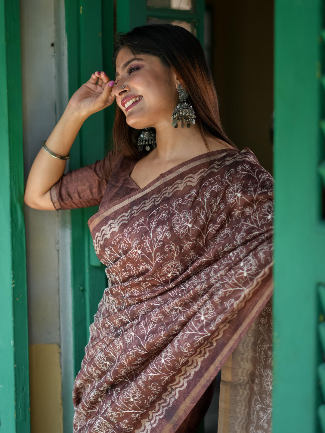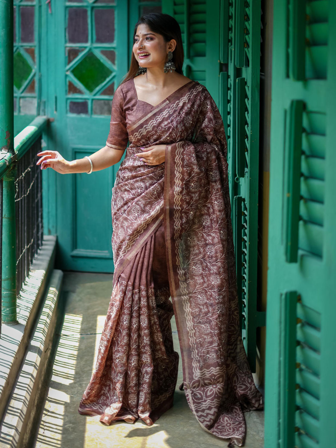 Beige and Brown color Saree in Tussar Silk fabric with Embroidered, Printed work