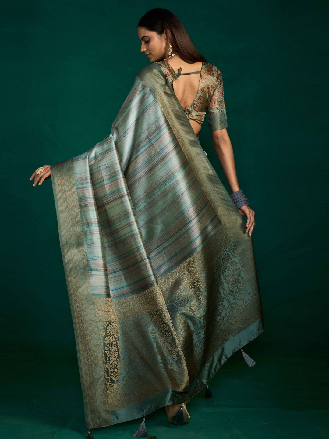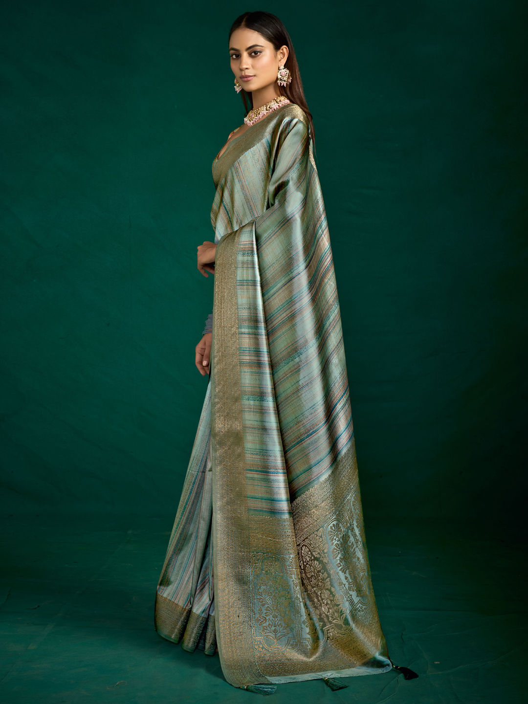 Black and Grey, Green color Saree in Tussar Silk fabric with Digital Print, Weaving work