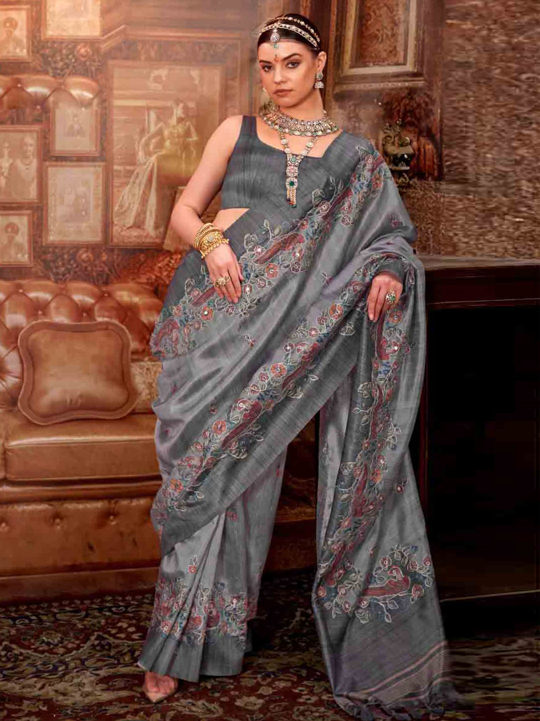 Black and Grey color Saree in Tussar Silk fabric with Printed work