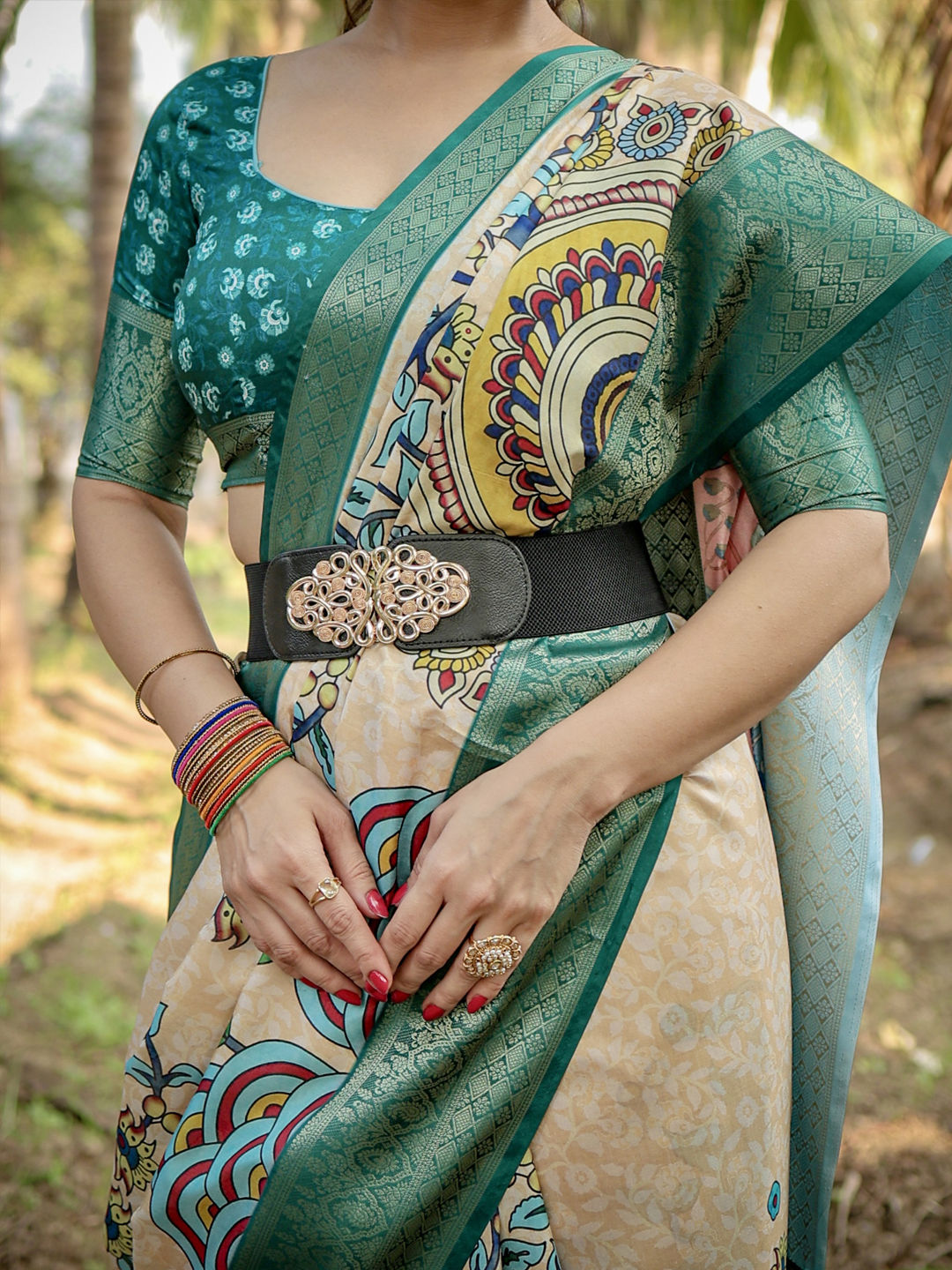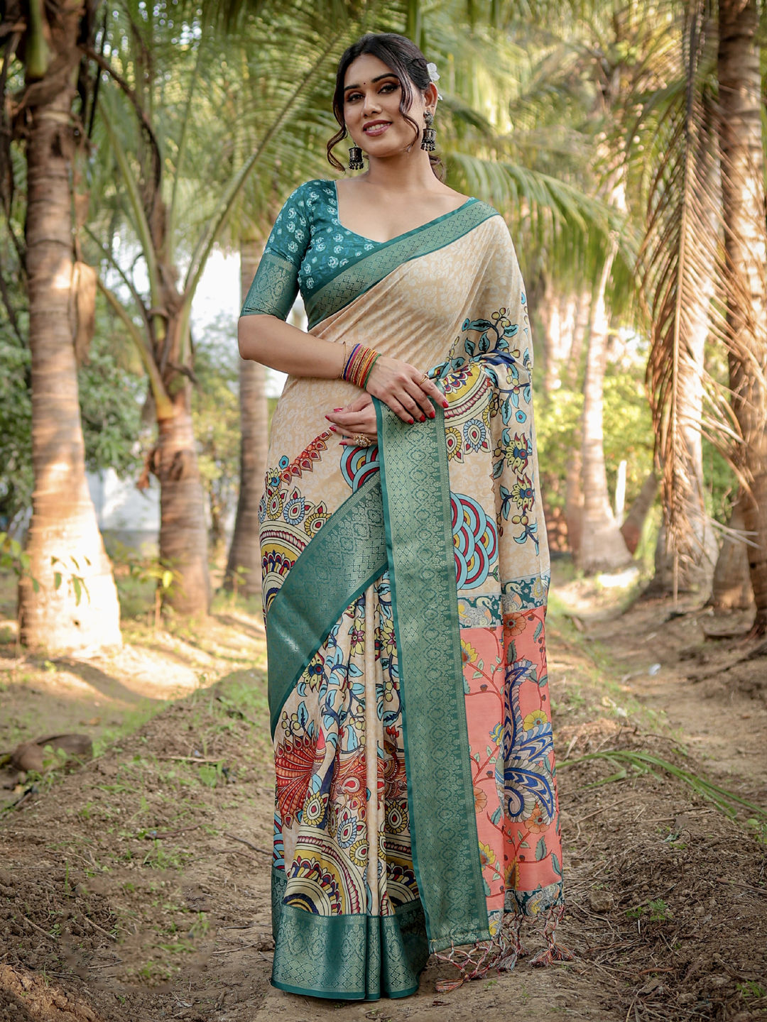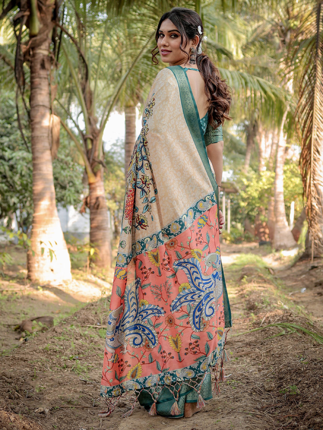 Green color Saree in Tussar Silk fabric with Floral, Printed, Weaving work